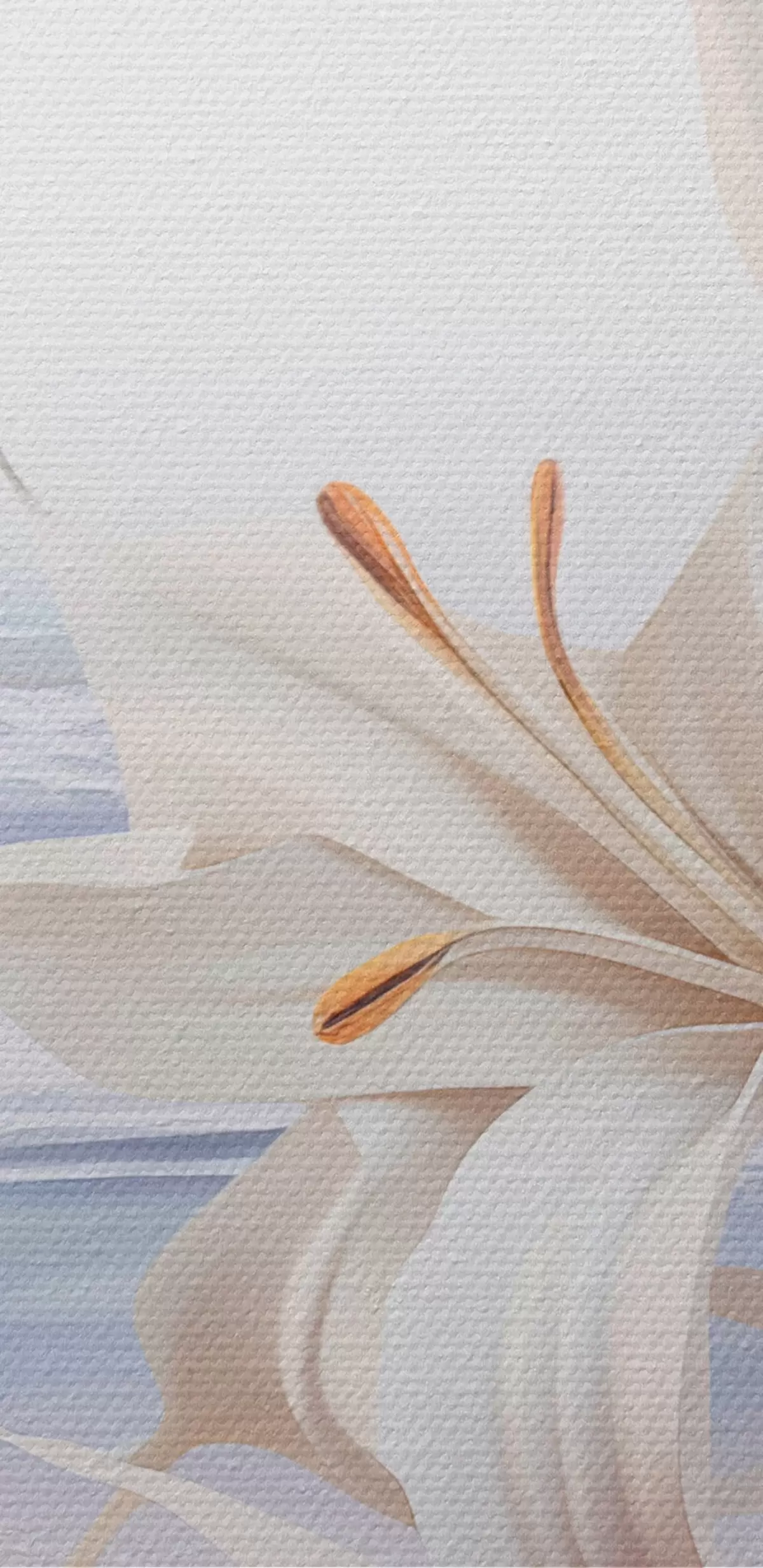 Kép Fehér liliom narancssárga virágzattal és hosszú levelekkel a tengerparton, lágy hullámokkal a háttérben, pasztell színekben Nr r44850
