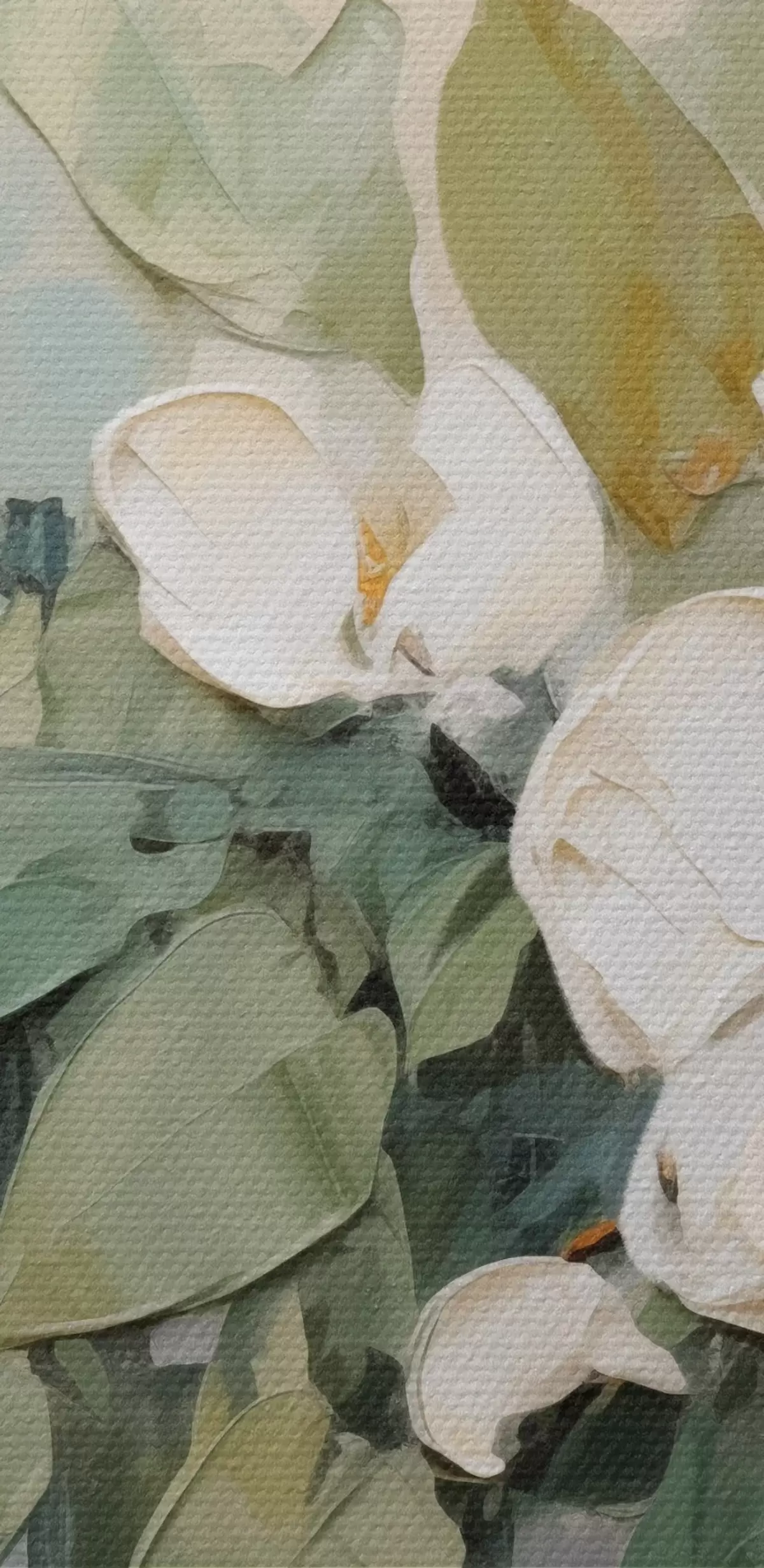 Kép Magnólia virágok zöld levelekkel egy ágon, impasto texturált stílus, lágy színpaletta Nr r44853