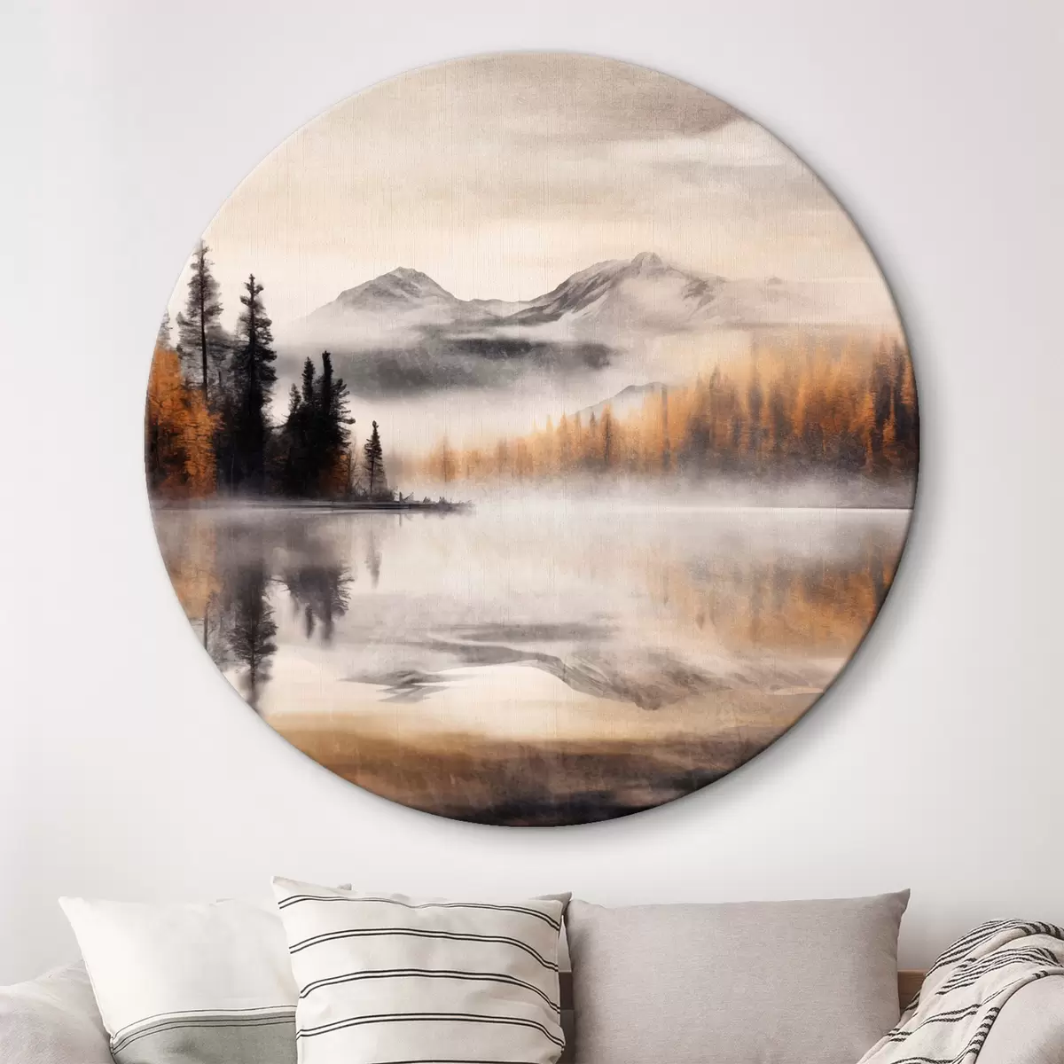 Kép Ködös textúrájú tó táj fenyőfákkal és hegyekkel, felhős szürke égbolton Nr r44856