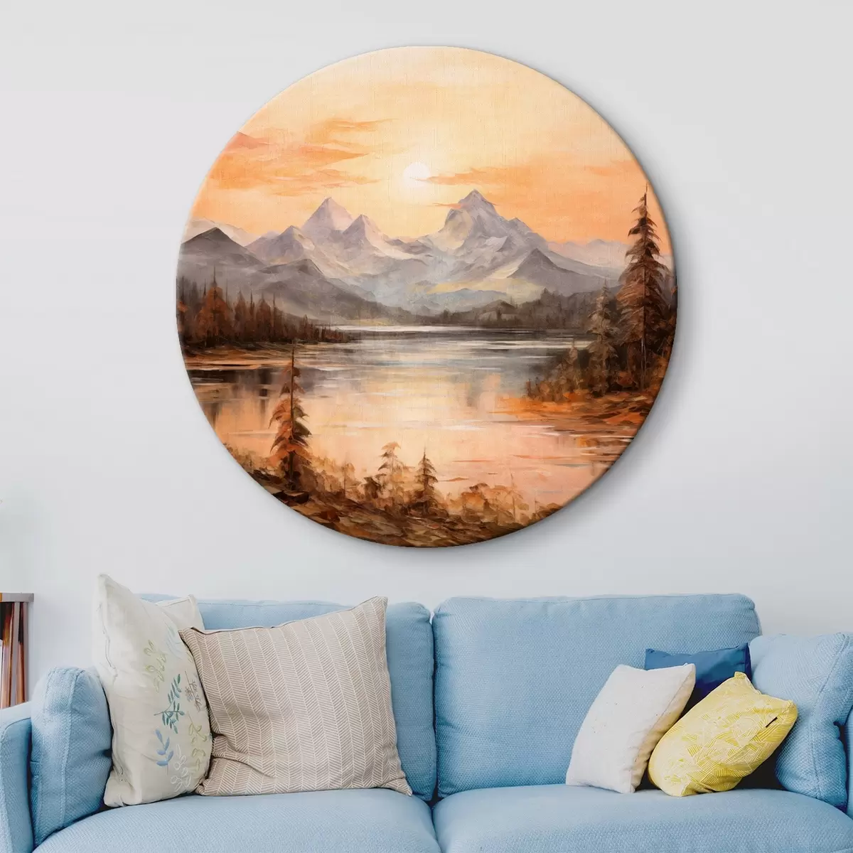 Kép Tájkép egy tó körül fákkal és hegyekkel a háttérben, narancssárga égbolt a napfénnyel Nr r44857