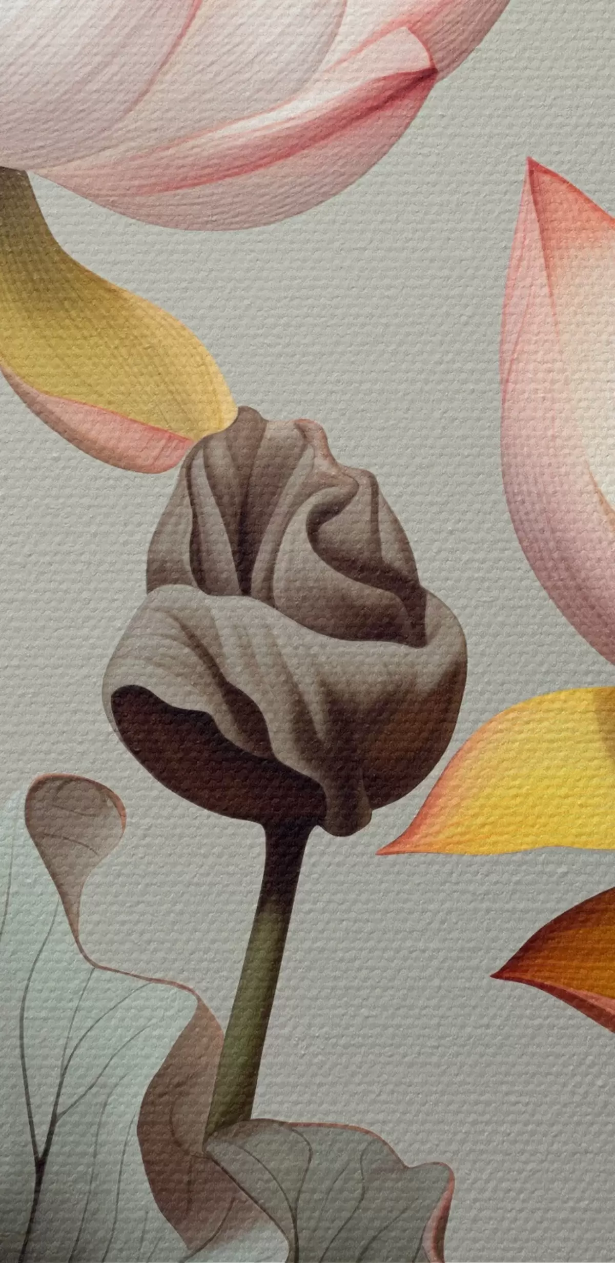 Kép Lótuszvirágok pasztell szirmokkal és zöld levelekkel, visszafogott színpalettán, egyszínű háttér előtt Nr r44862