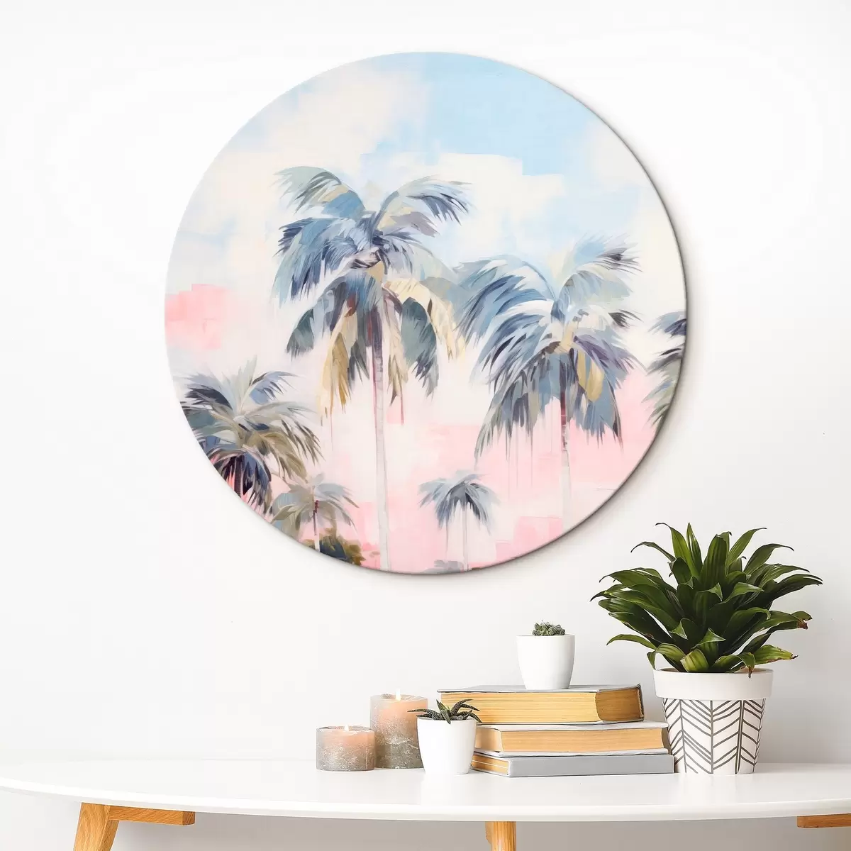 Kép Pálmafák pasztellszínű levelekkel és barna törzsekkel, rózsaszín és kék égbolt, trópusi környezet Nr r44866