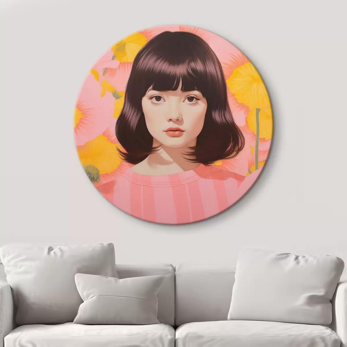 Kép Dekoratív minimalista portré ázsiai lányról egy sárga és rózsaszín virágokból álló mezőben Nr r44924