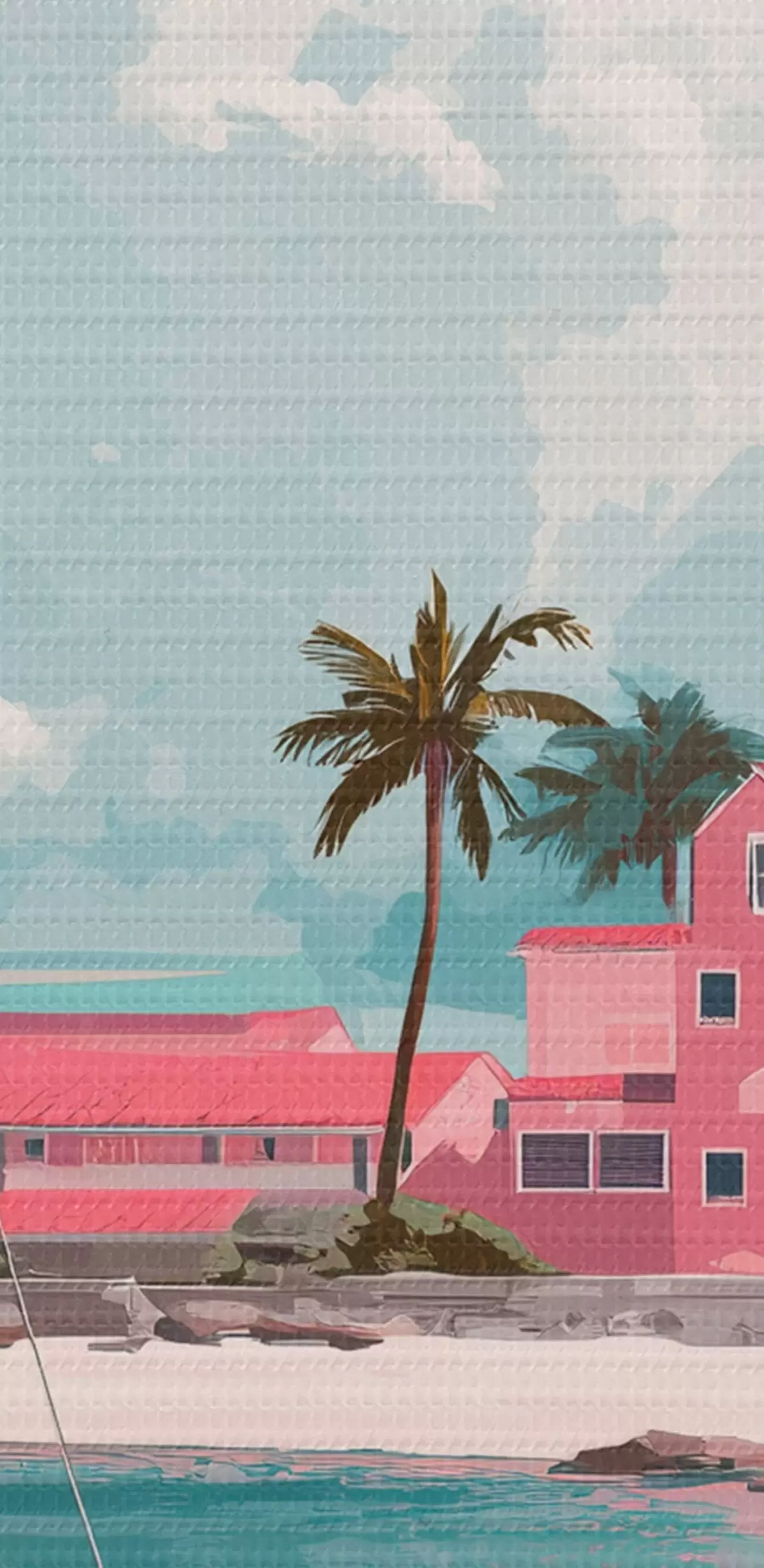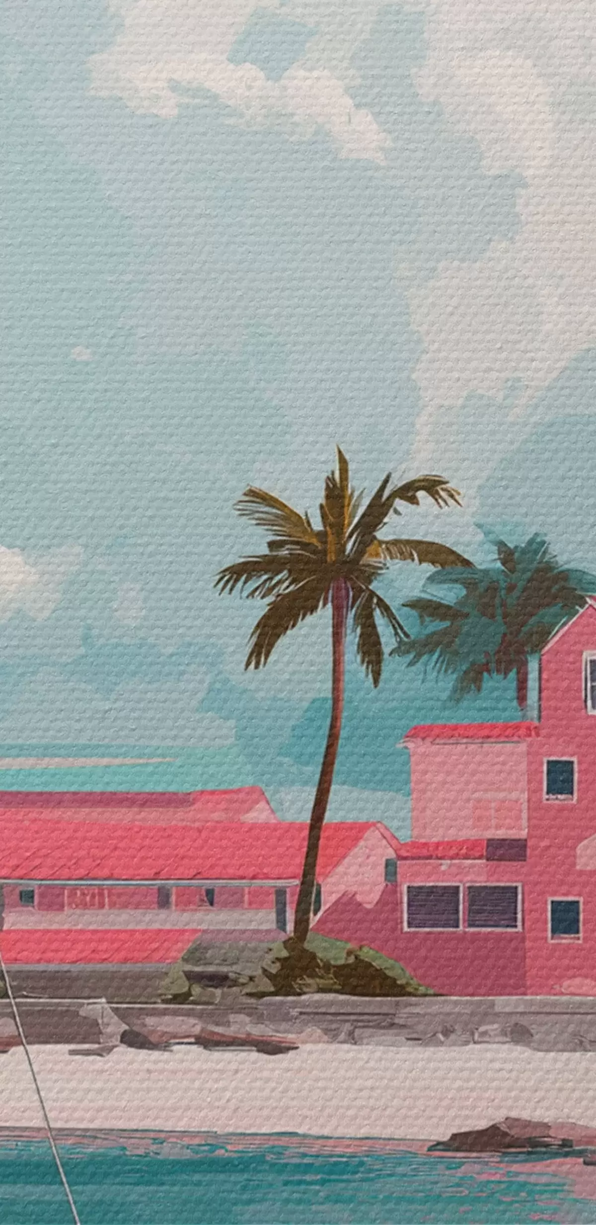 Kép Rózsaszín strand ragyogó napsütéssel, vitorlással és házakkal Nr r44986