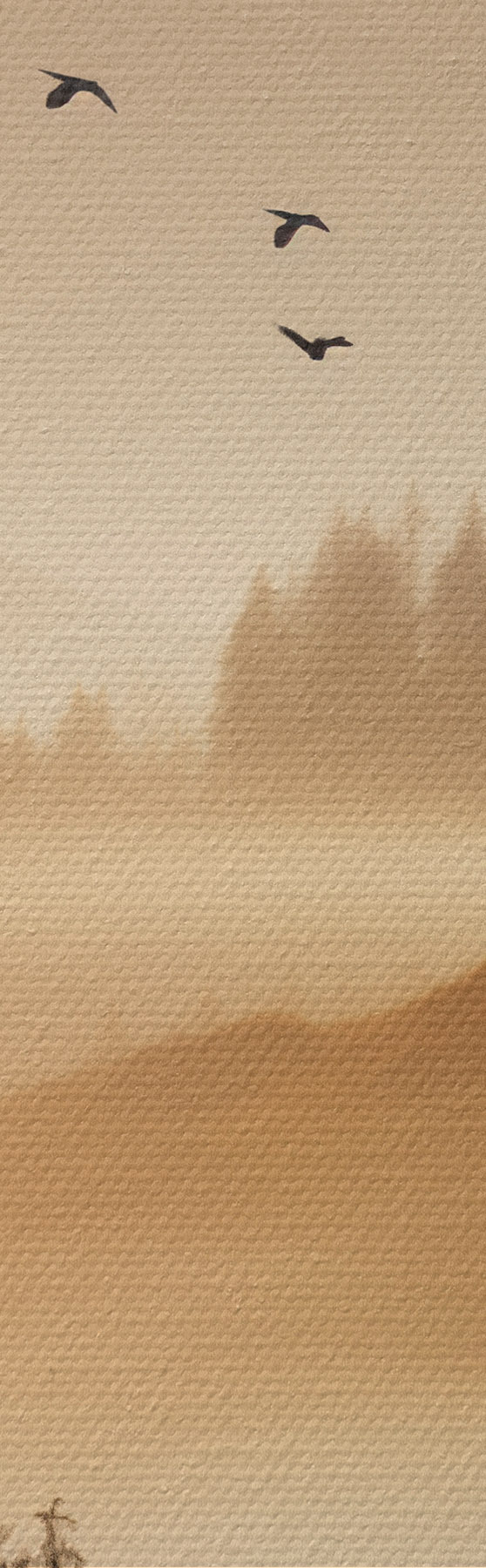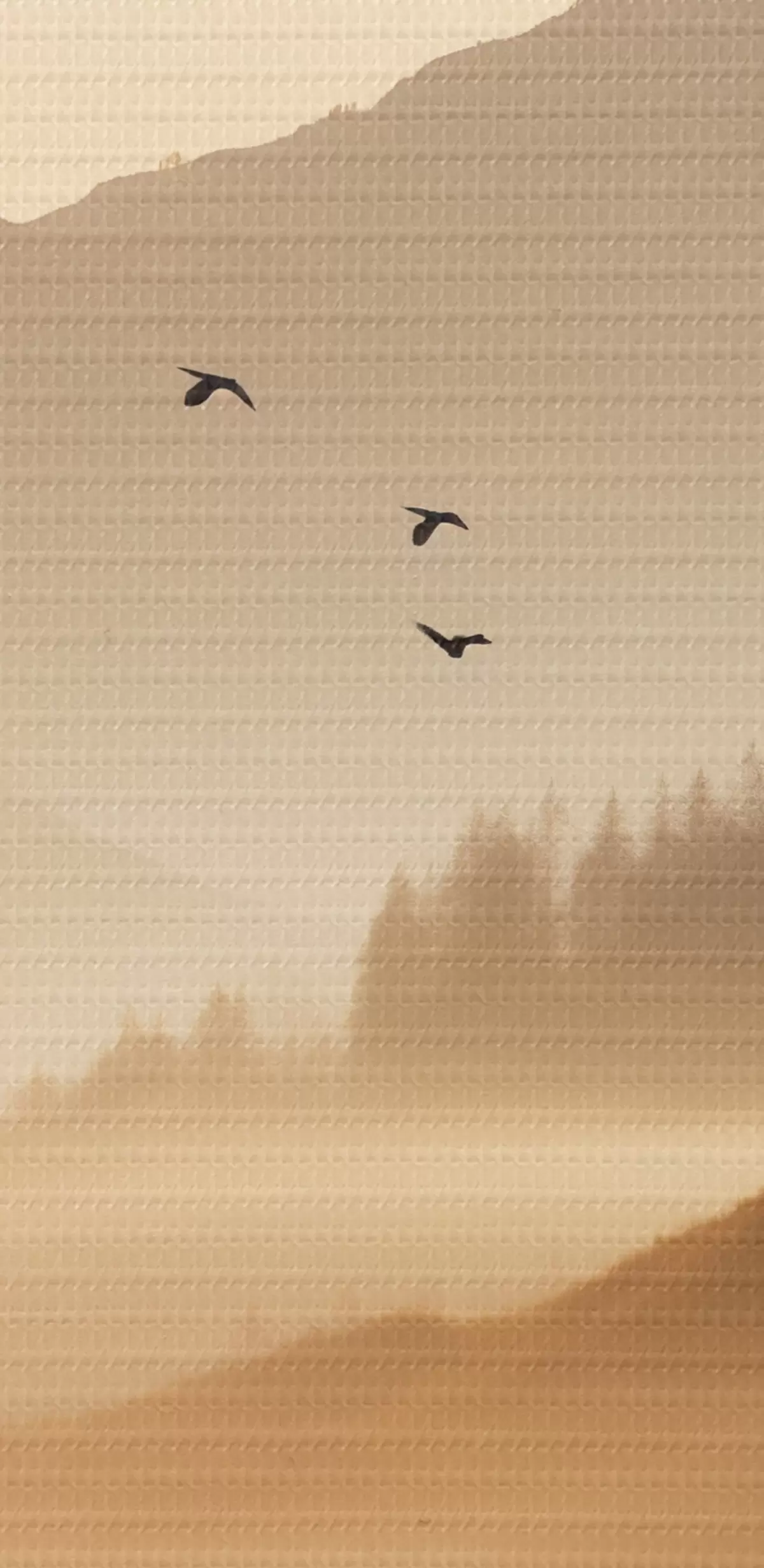 Kép Hegyi táj, erdő és madarak repülnek az égen , mindezt vastag köd borítja napfelkeltekor Nr r45563