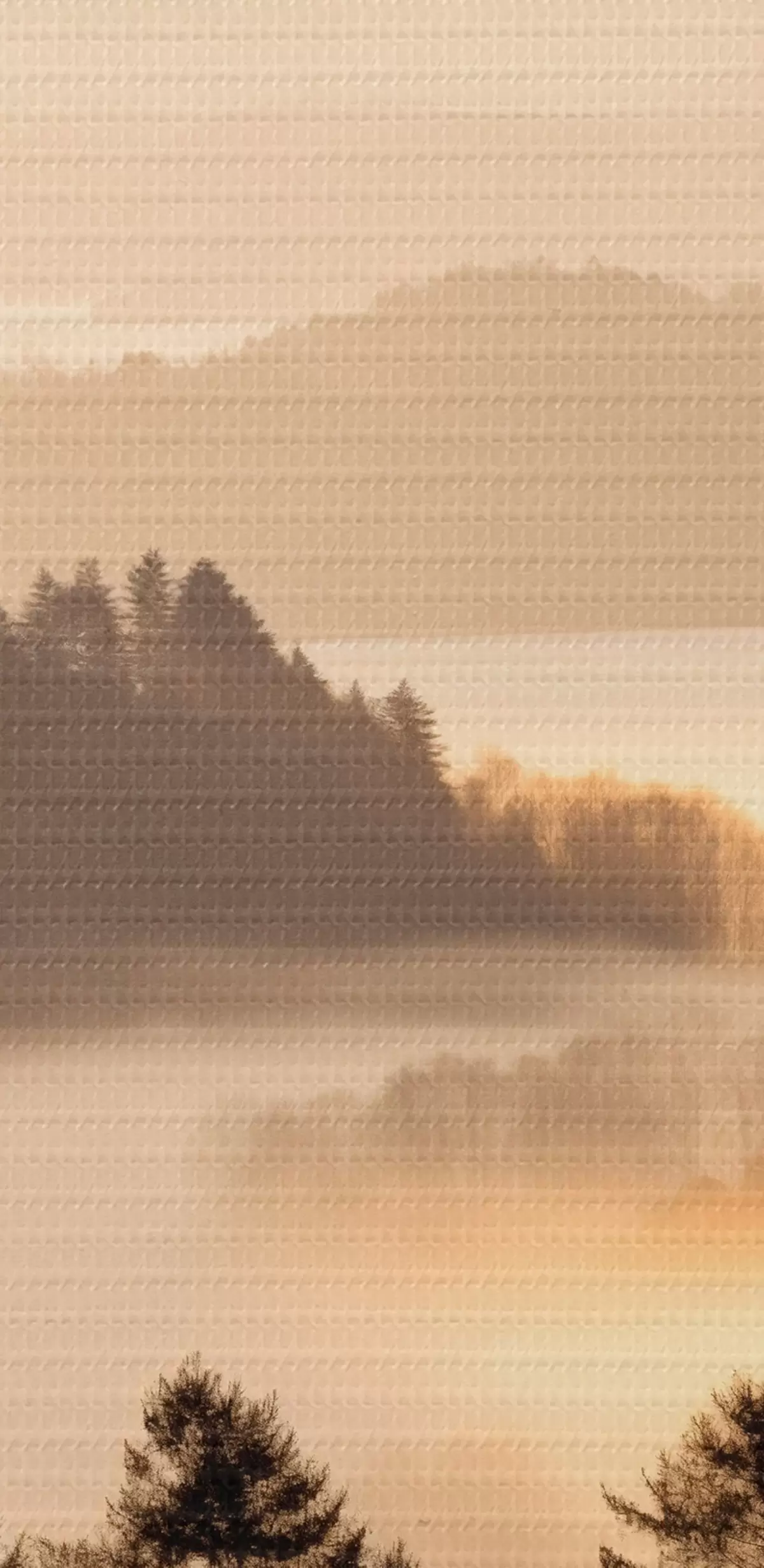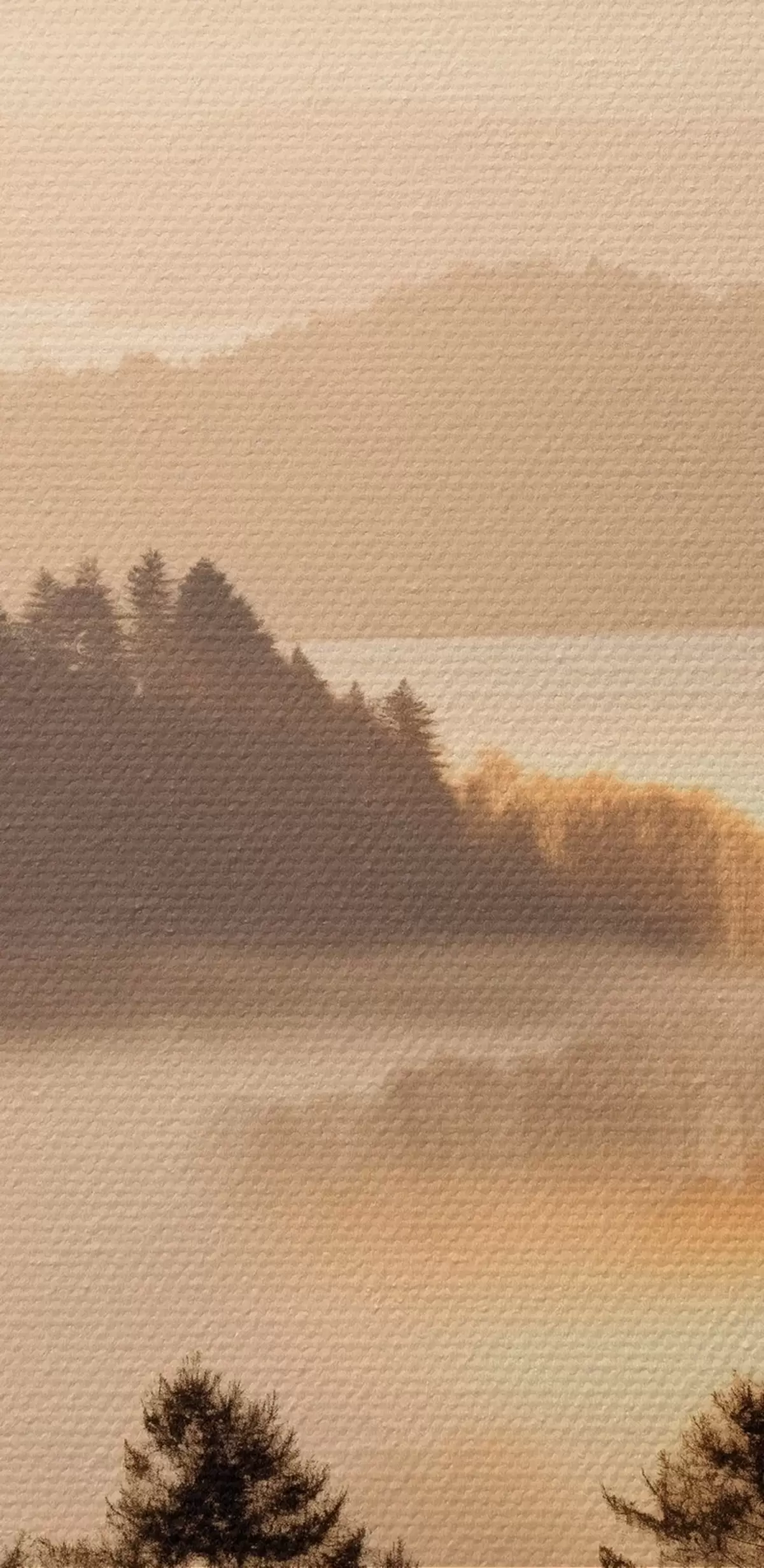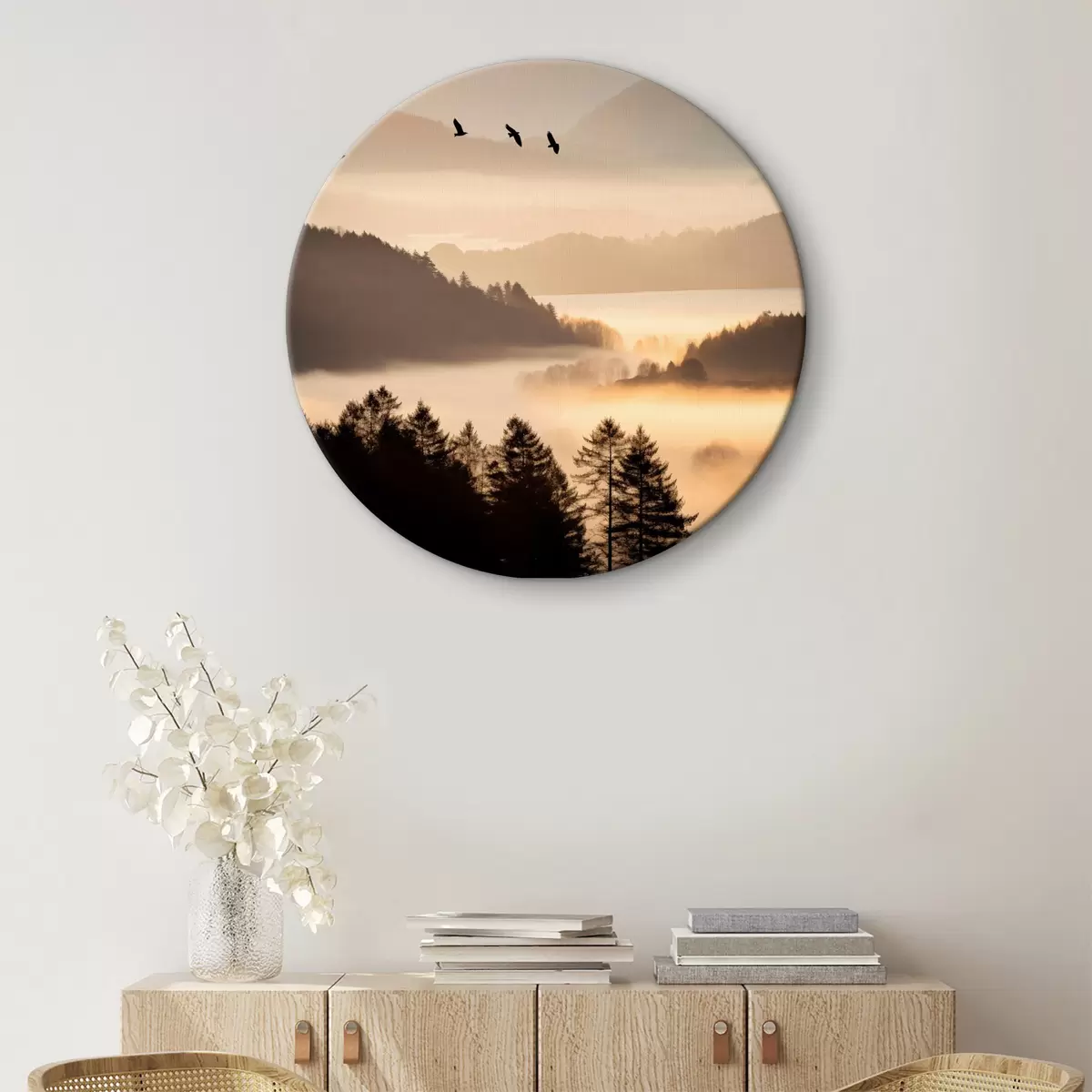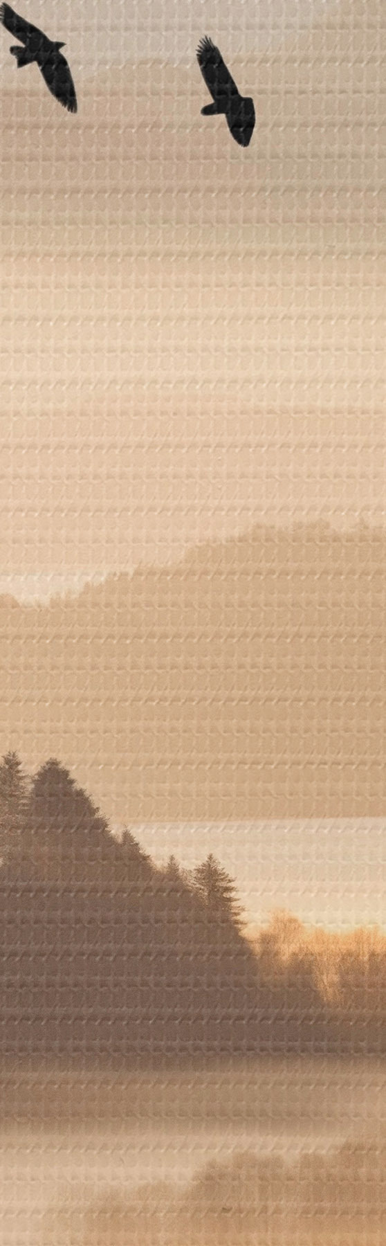 Kép Hegyi táj, erdő és madarak repülnek az égen , mindezt vastag köd borítja napfelkeltekor Nr r45564