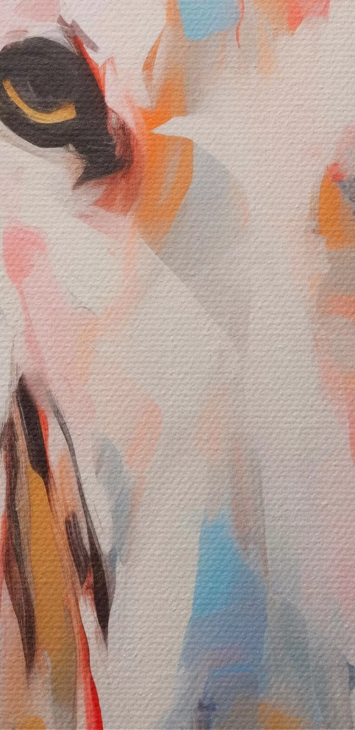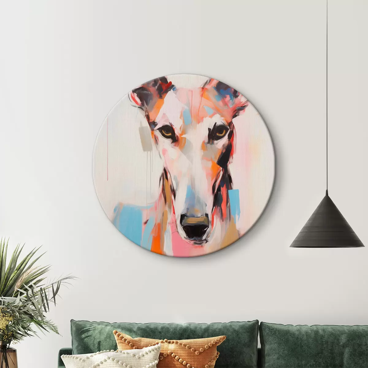 Kép Egy agár kutya, élénk színekkel, mint a narancs, rózsaszín és kék, egy egyszerű fehér háttér előtt Nr r45565