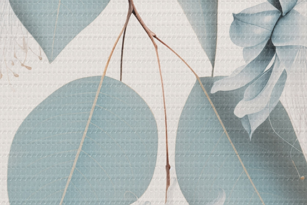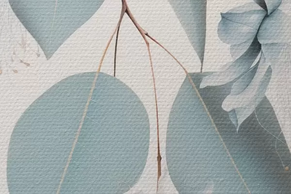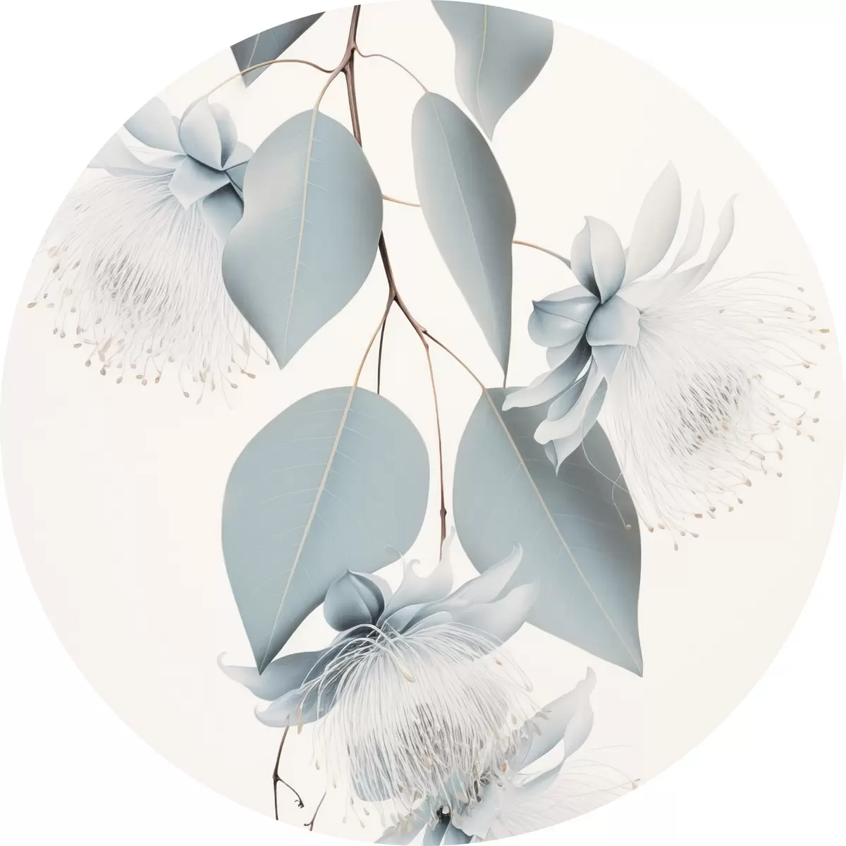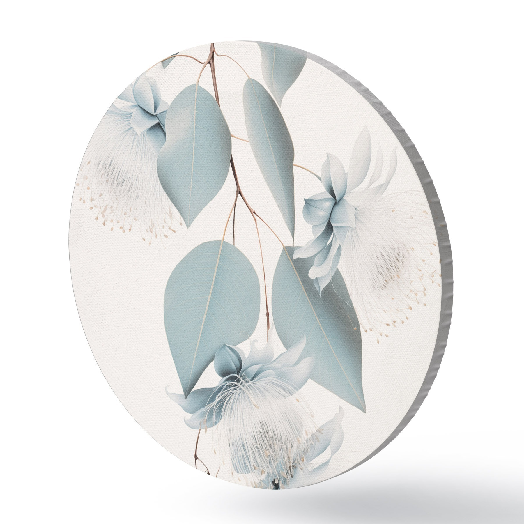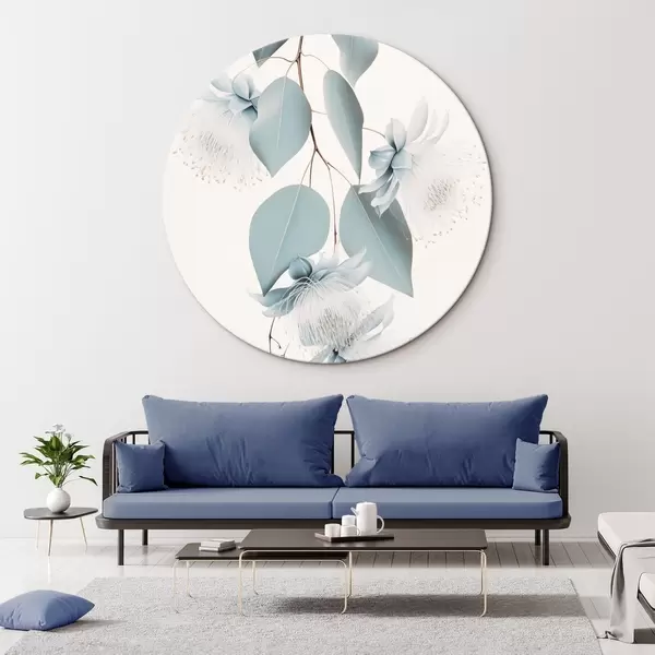 Kép Eukaliptusz ág kék levelekkel és fehér virágokkal, világos háttérrel Nr r45947