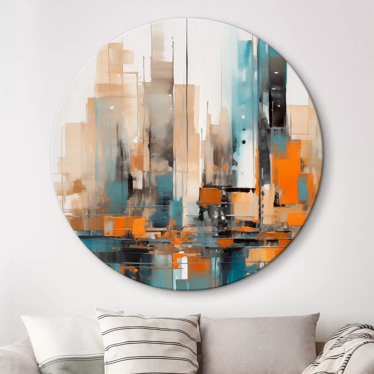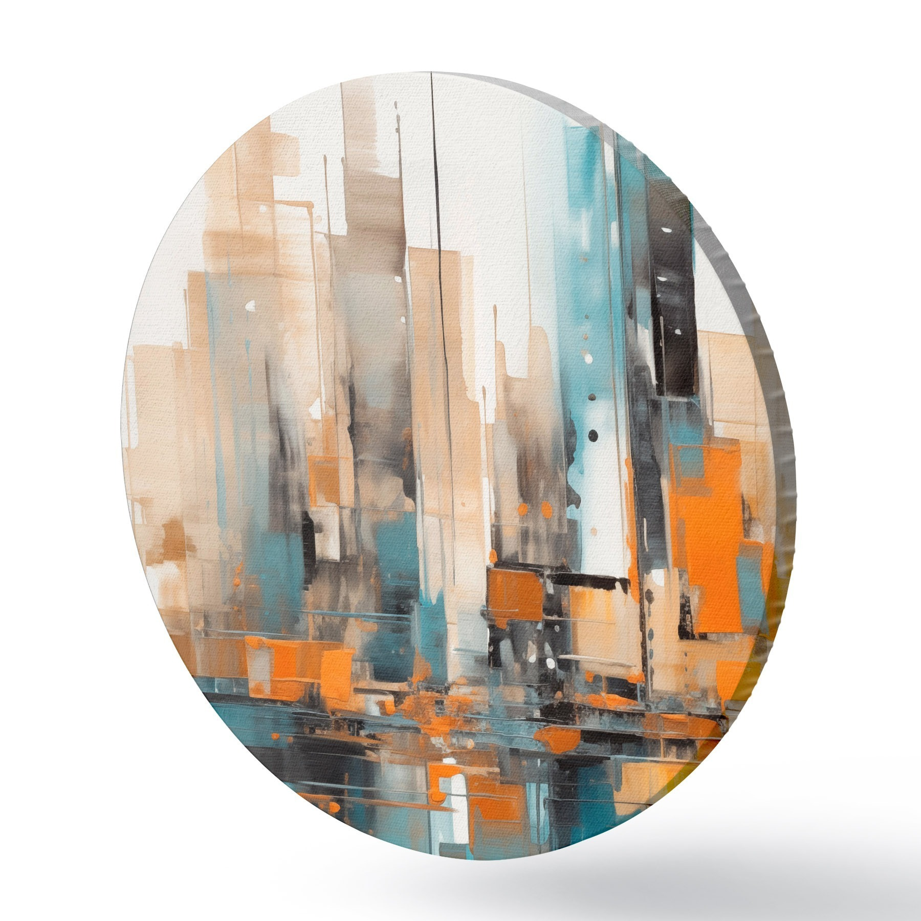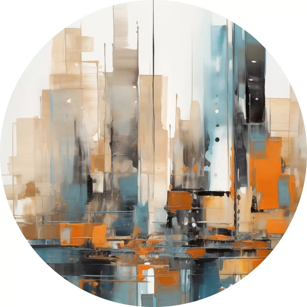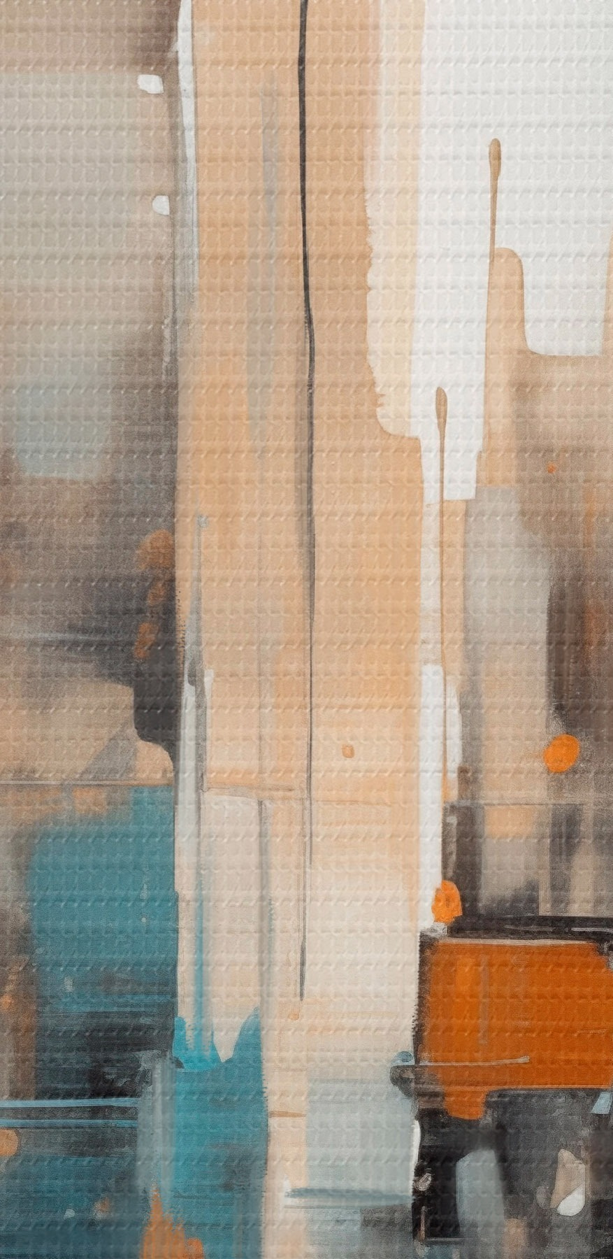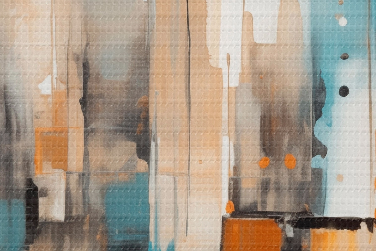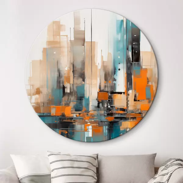 Kép Absztrakt városi tájkép narancssárga, türkizkék és barna színű, függőleges ecsetvonásokkal és geometrikus formákkal Nr r46266