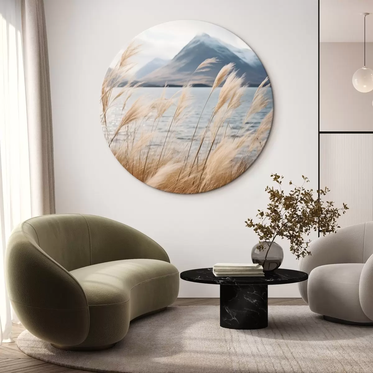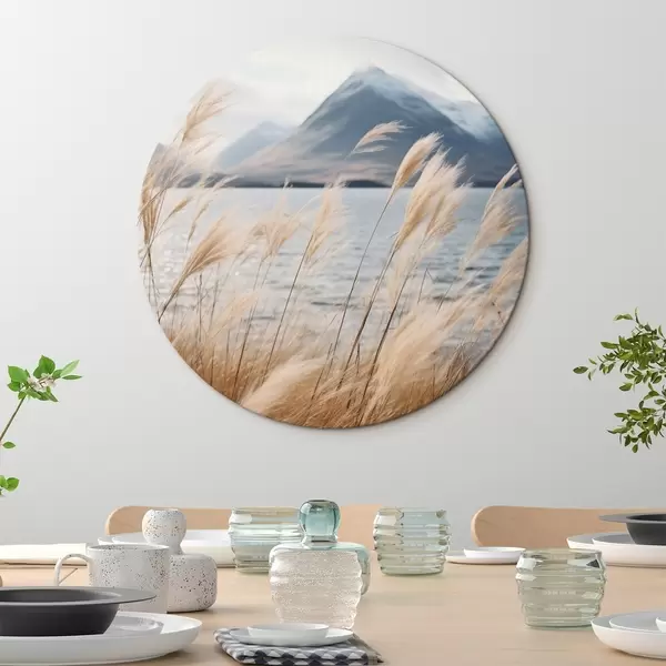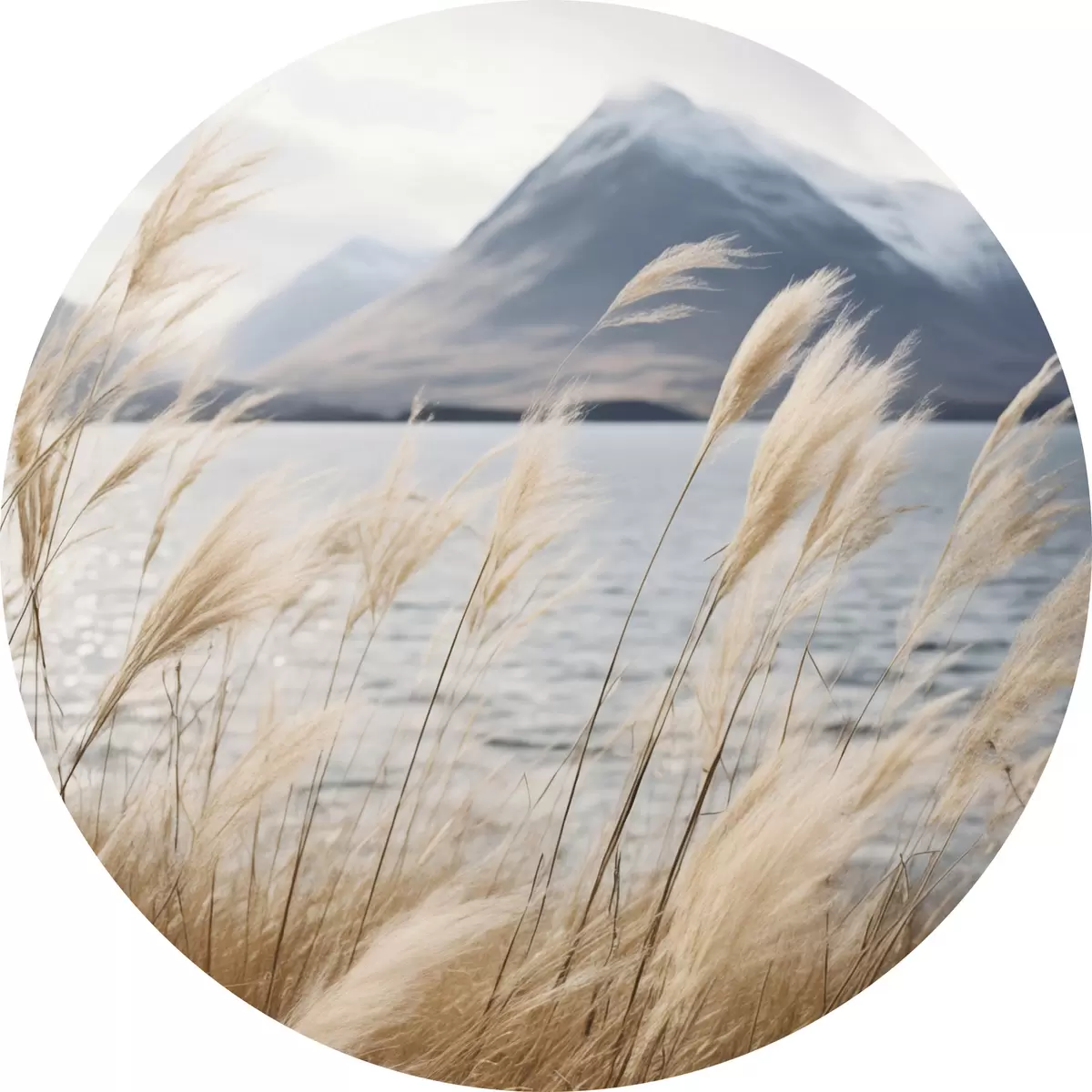Kép Pampas fű, háttérben tóval és hegyekkel, lágy megvilágítás, tompított színek, naturalisztikus stílus Nr r46283