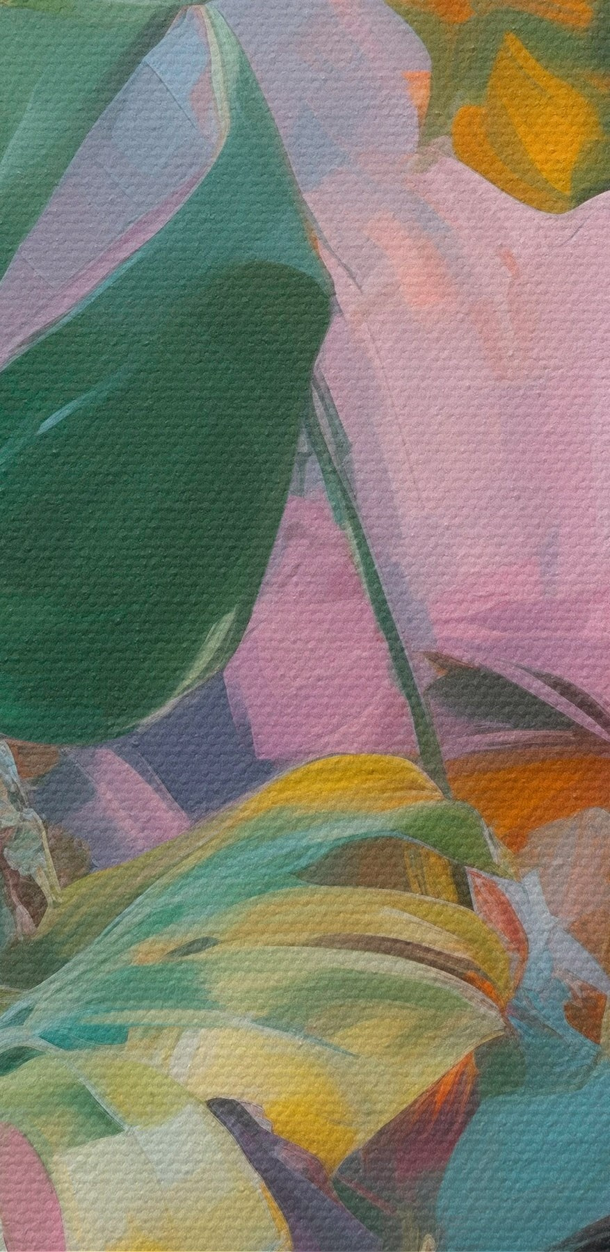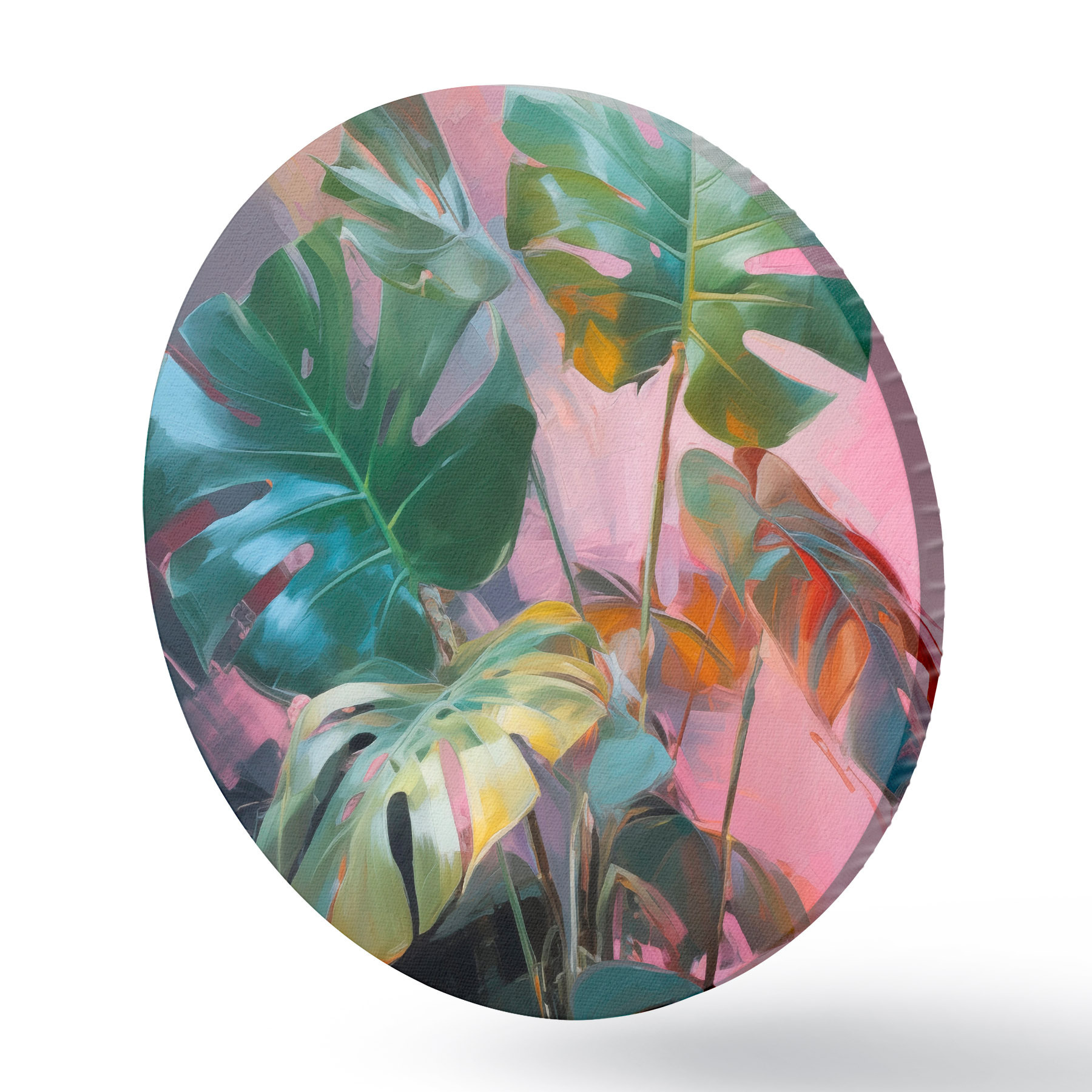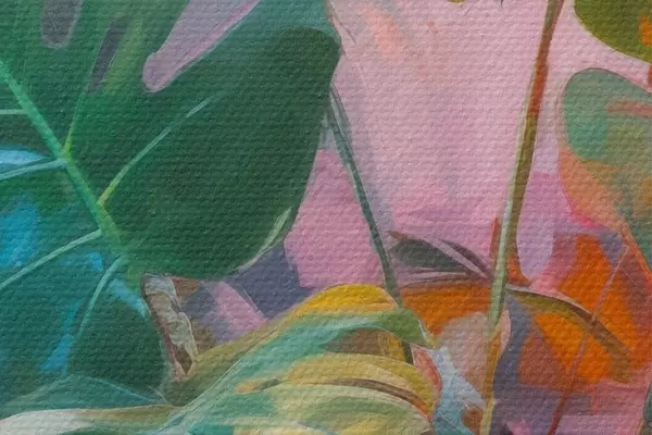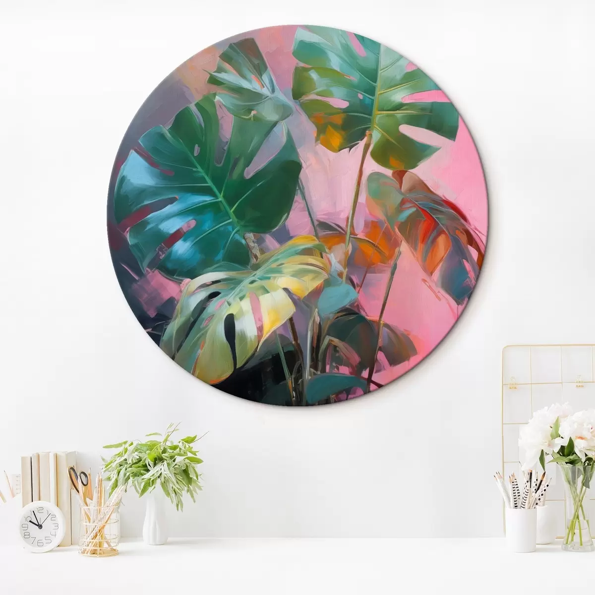 Kép Absztrakt monstera növény élénkzöld levelekkel, lágy rózsaszín és lila árnyalatok háttérében Nr r46286