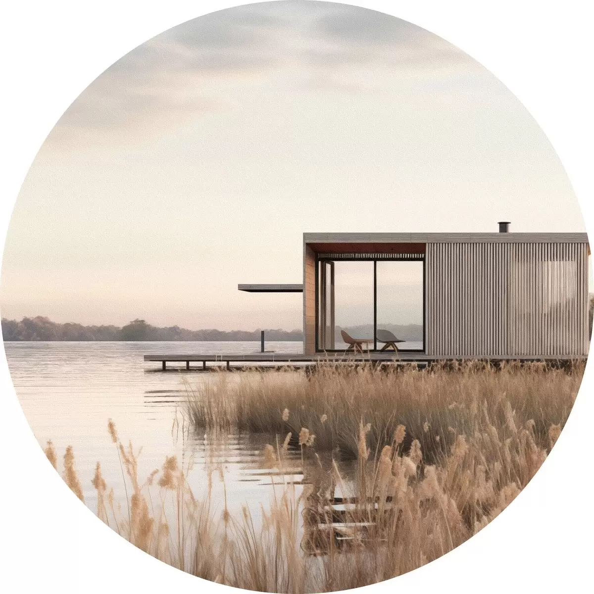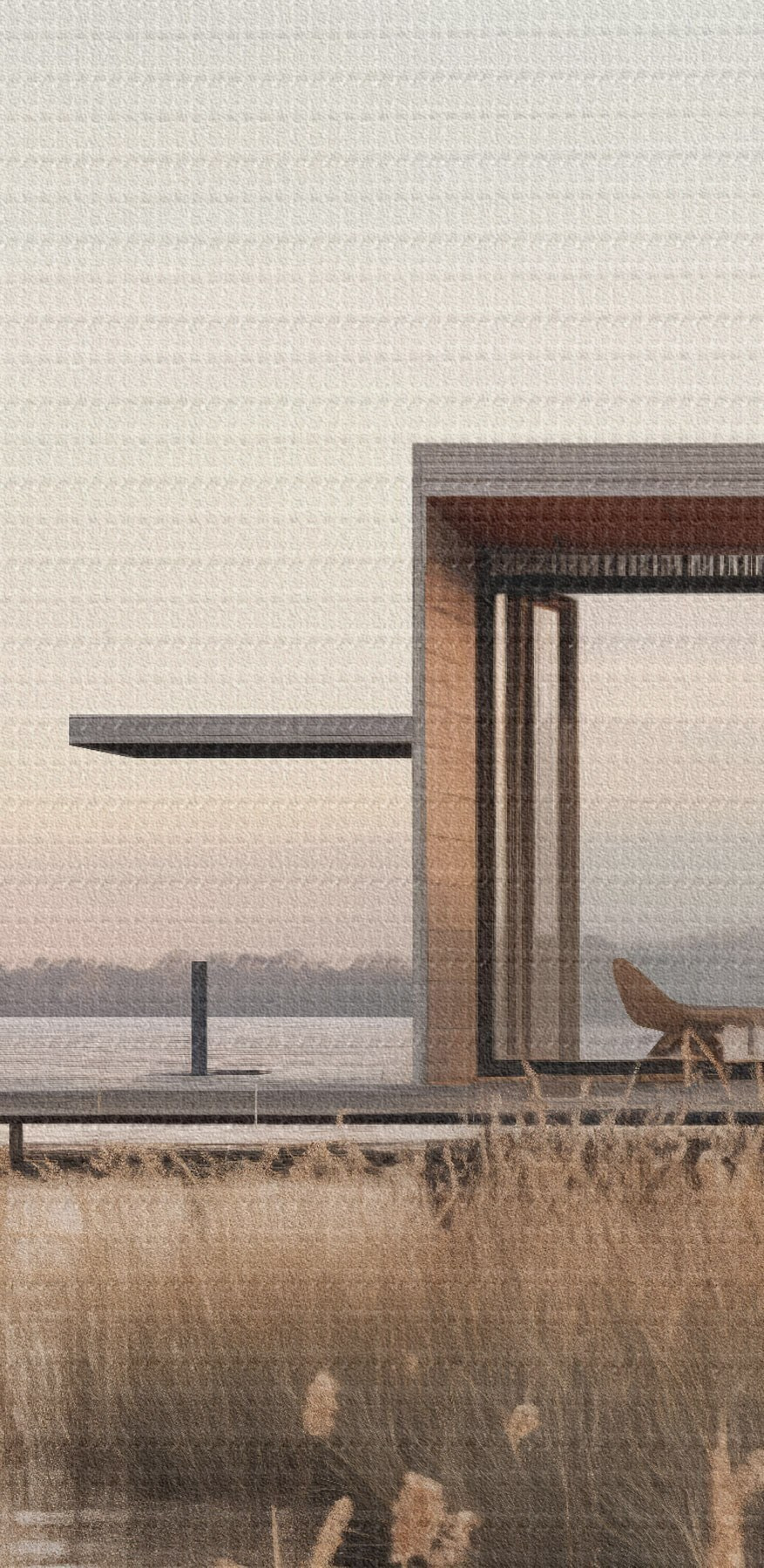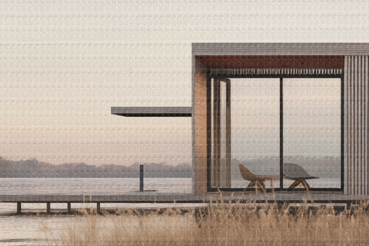 Kép Modern tóparti faház a nádas között, lágy alkonyatkor Nr r46513