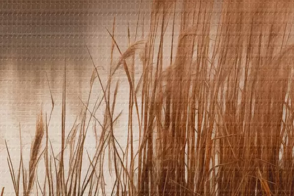 Kép Magas nádasok nőnek egy víztestben, a víz tükrözi a nádasokat, ködös háttér, lágy fény, természeti táj Nr r46695