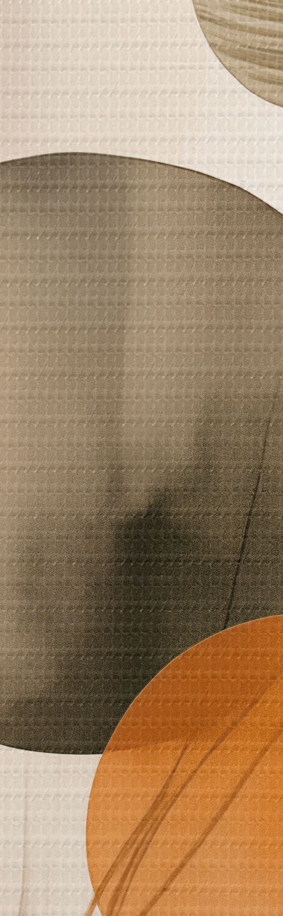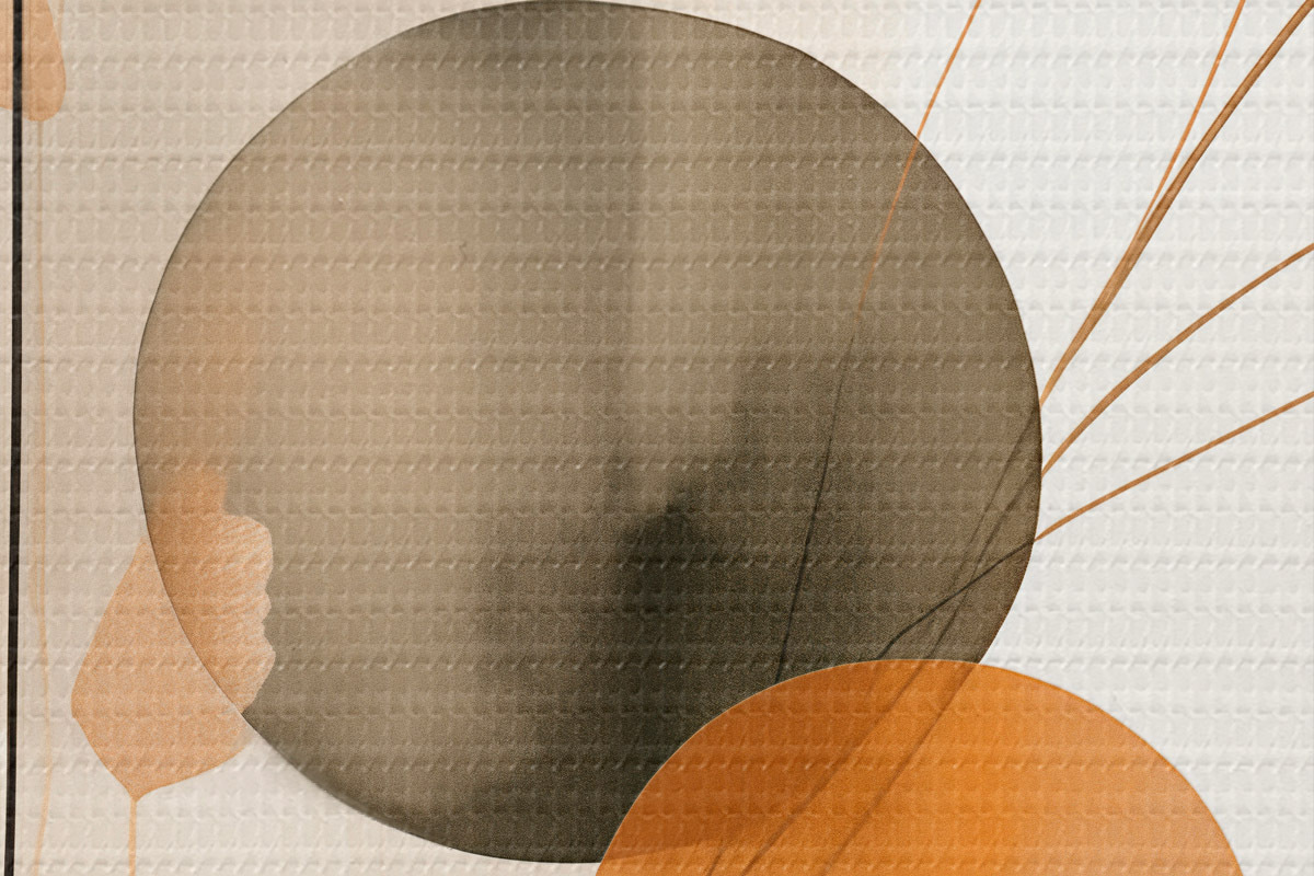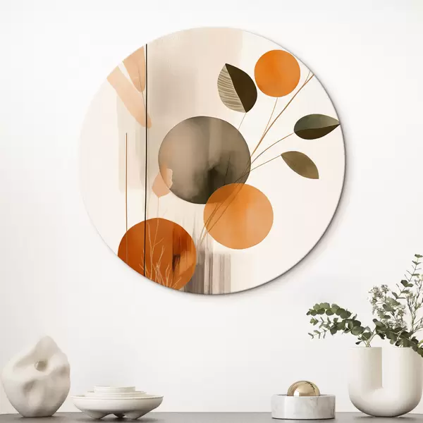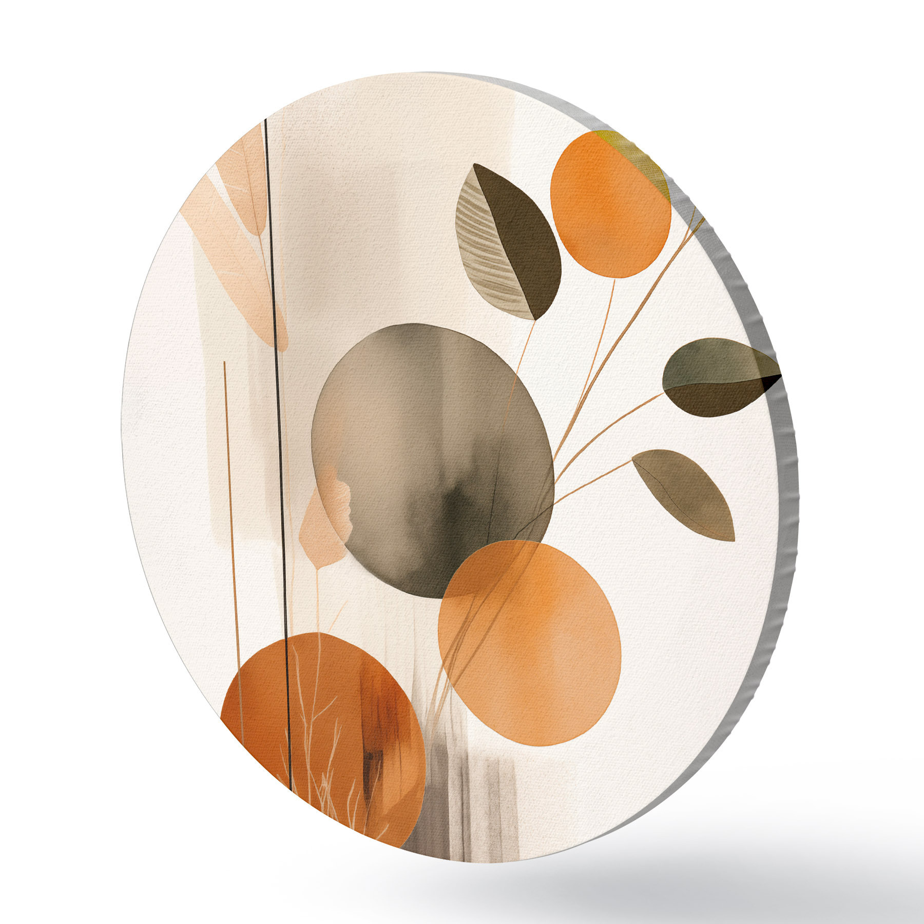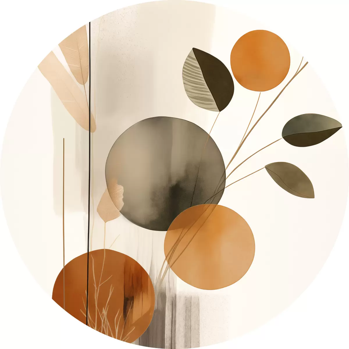 Kép Absztrakt festmény utánzat narancssárga és szürke körökkel, levelekkel és ágakkal, modern stílusban, akvarellhatással Nr r46697