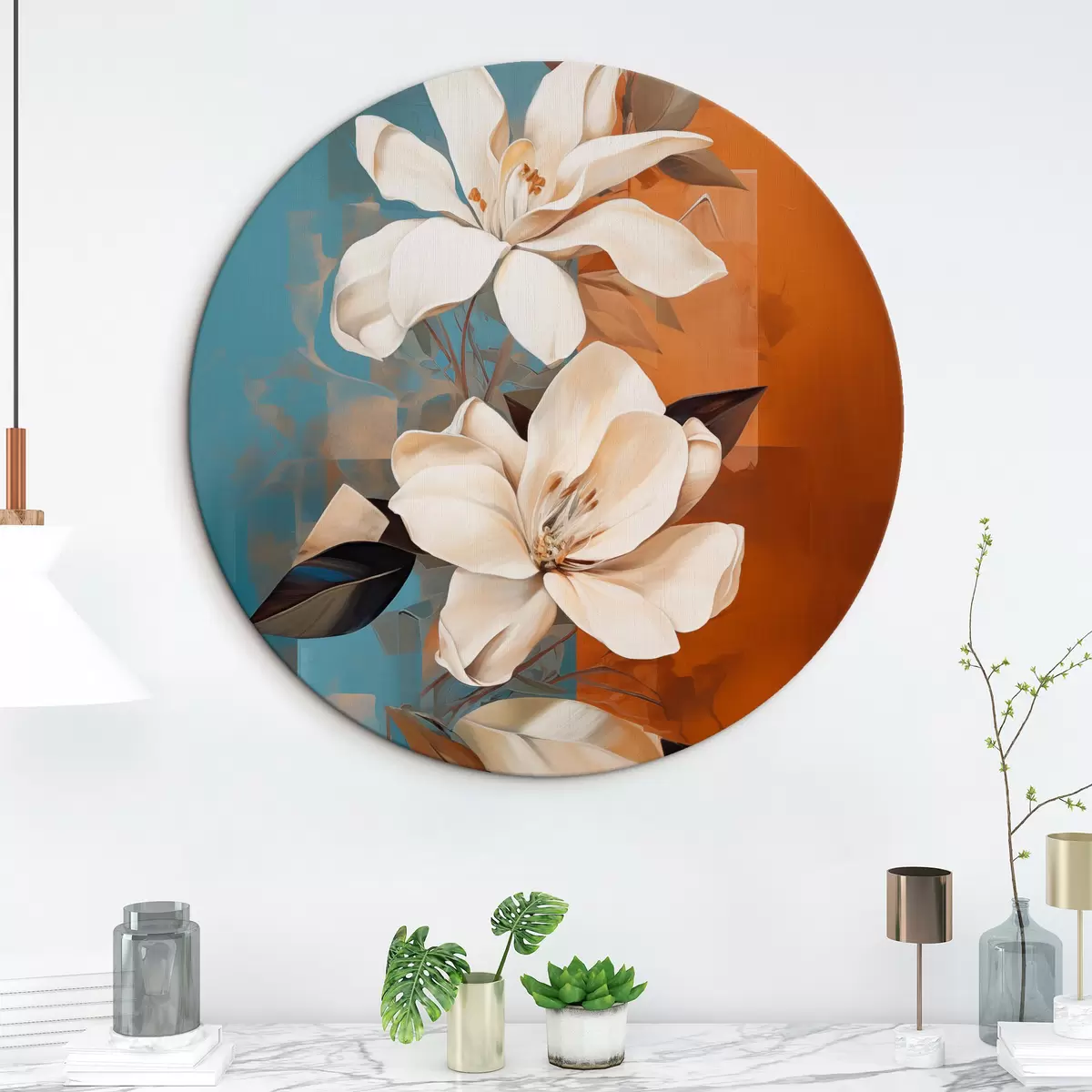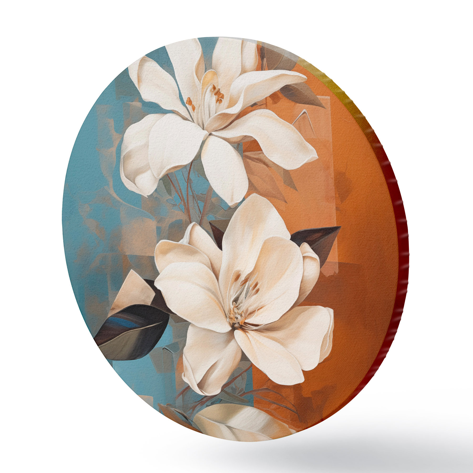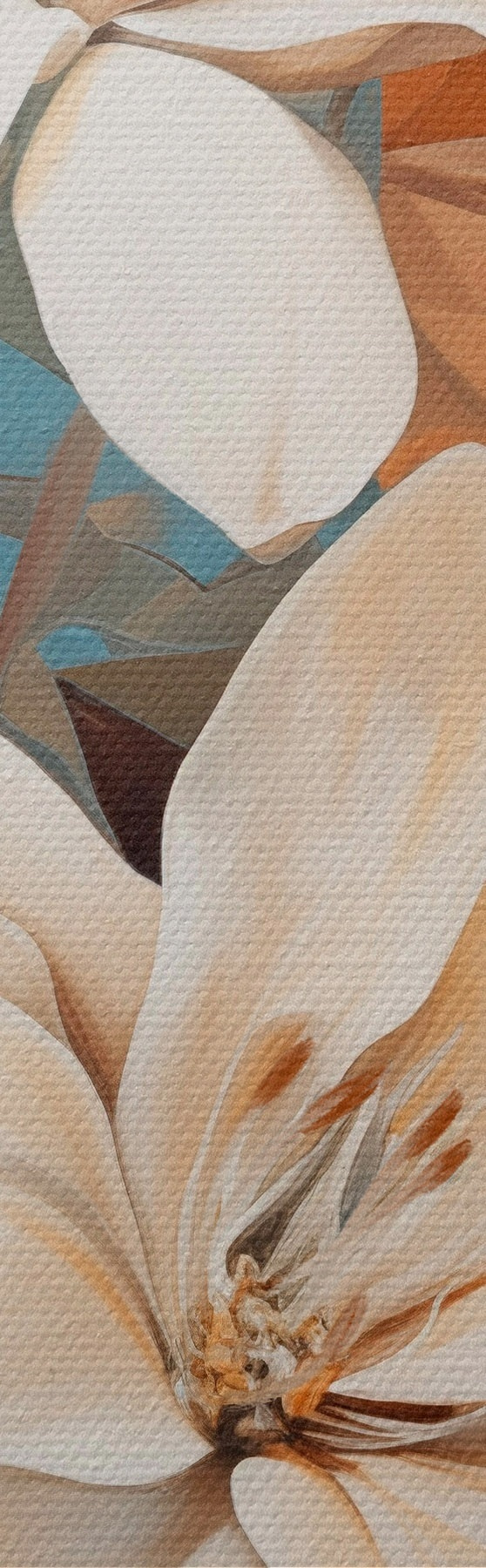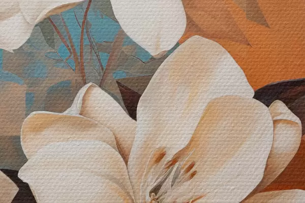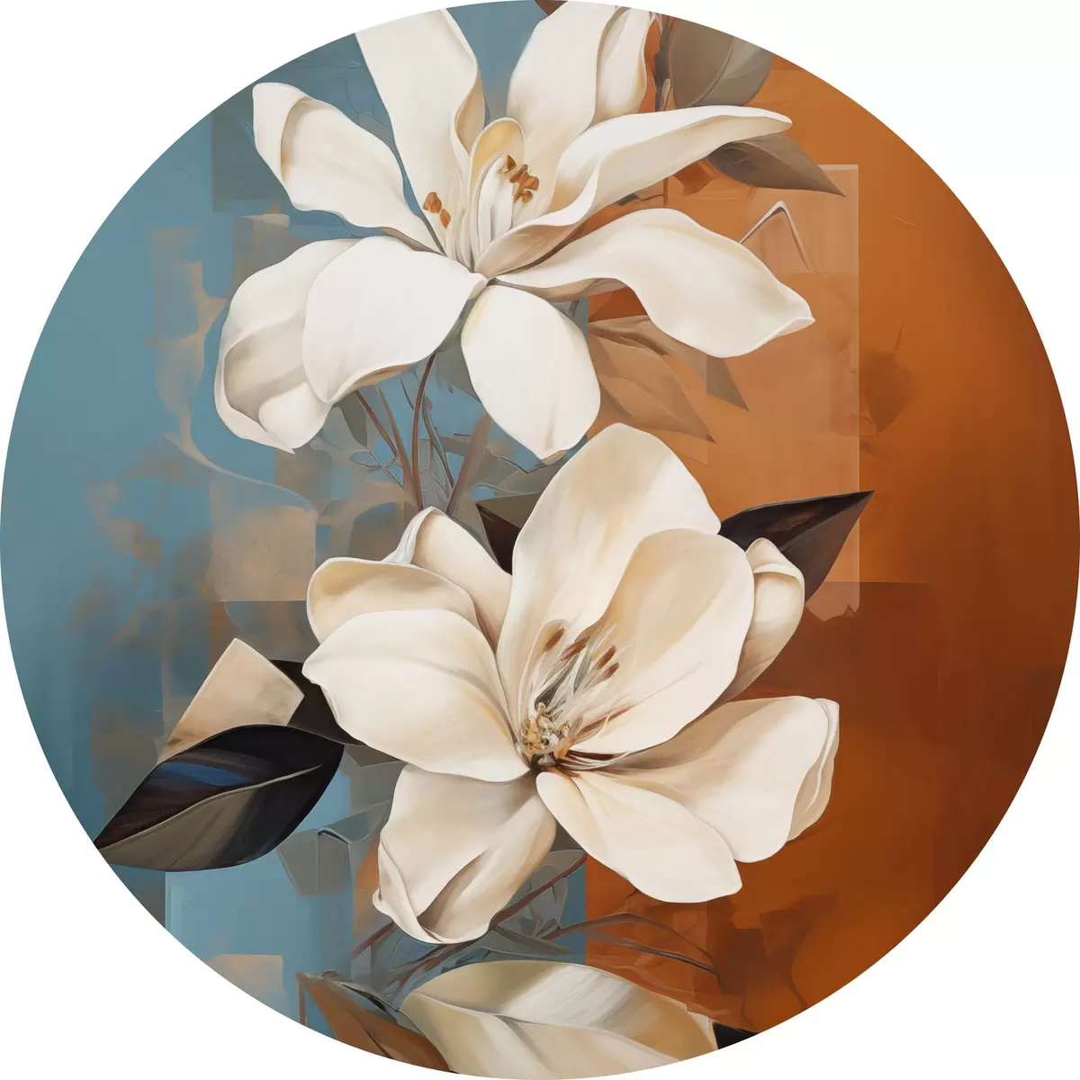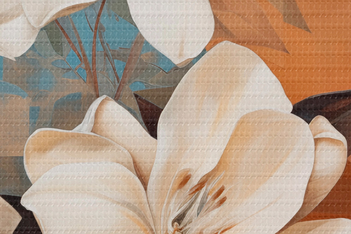 Kép Absztrakt fehér virágok és levelek barna és kék háttérrel, absztrakt formákkal, minimalista stílusban. Nr r46710