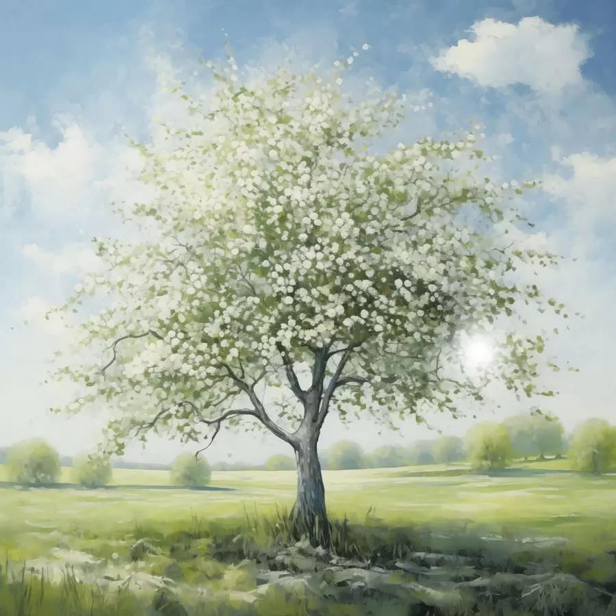 Fotótapéta Egy magányos fa a mezőn fehér virágokkal