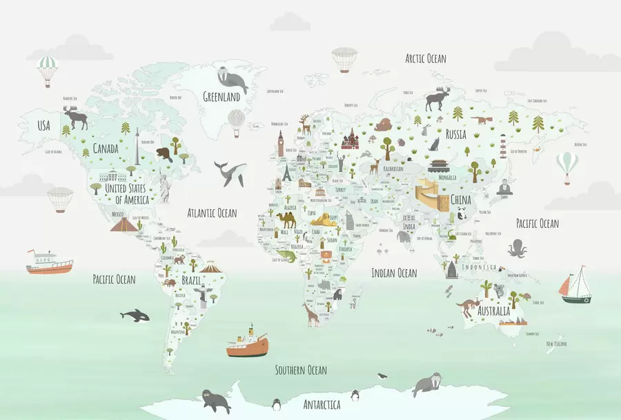 Fotótapéta Gyermek világtérkép állatokkal és nevezetességekkel