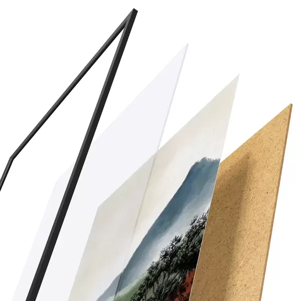 A poszter keretből, plexiből, nyomtatott képből és forgácslap hátlapból áll. A poszter a hátoldalon található rögzítőknek köszönhetően azonnal felakasztható a falra.