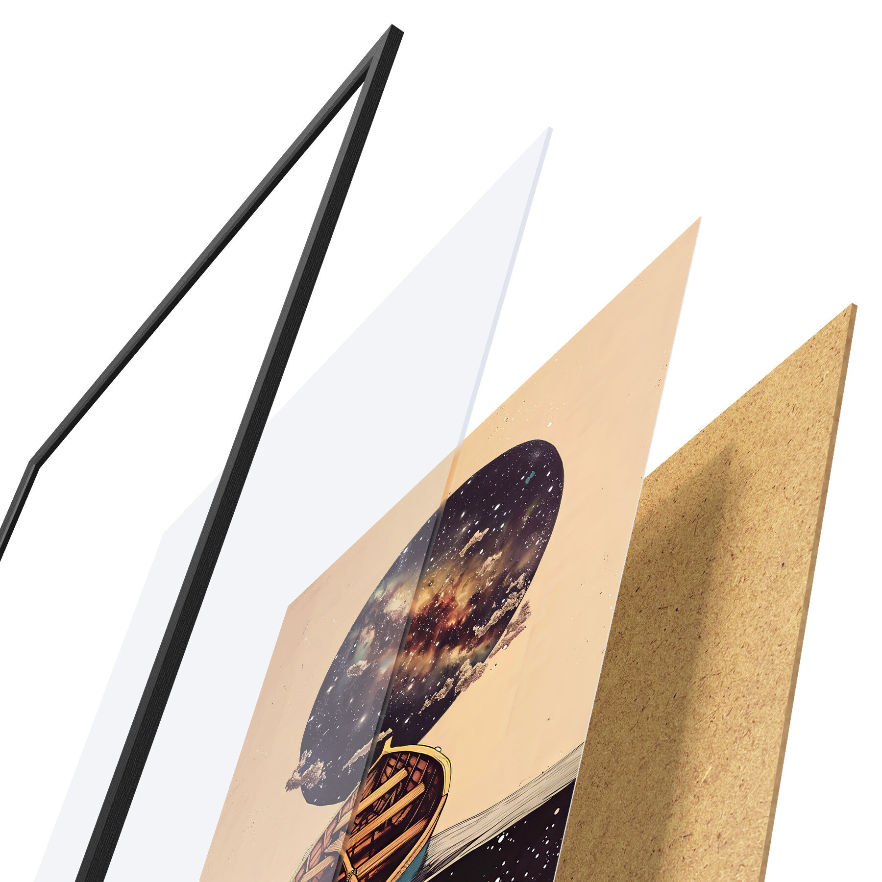 A poszter keretből, plexiből, nyomtatott képből és forgácslap hátlapból áll. A poszter a hátoldalon található rögzítőknek köszönhetően azonnal felakasztható a falra.