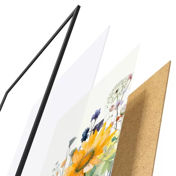 A poszter keretből, plexiből, nyomtatott képből és forgácslap hátlapból áll. A poszter a hátoldalon található rögzítőknek köszönhetően azonnal felakasztható a falra.