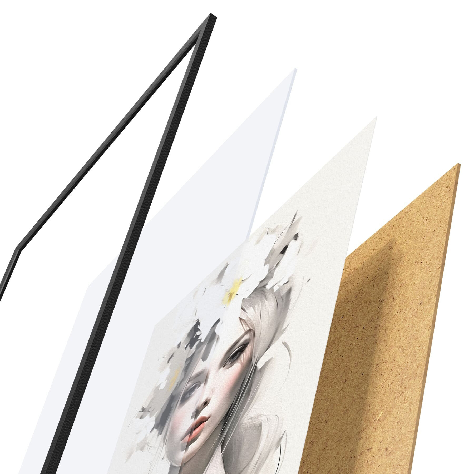 A poszter keretből, plexiből, nyomtatott képből és forgácslap hátlapból áll. A poszter a hátoldalon található rögzítőknek köszönhetően azonnal felakasztható a falra.