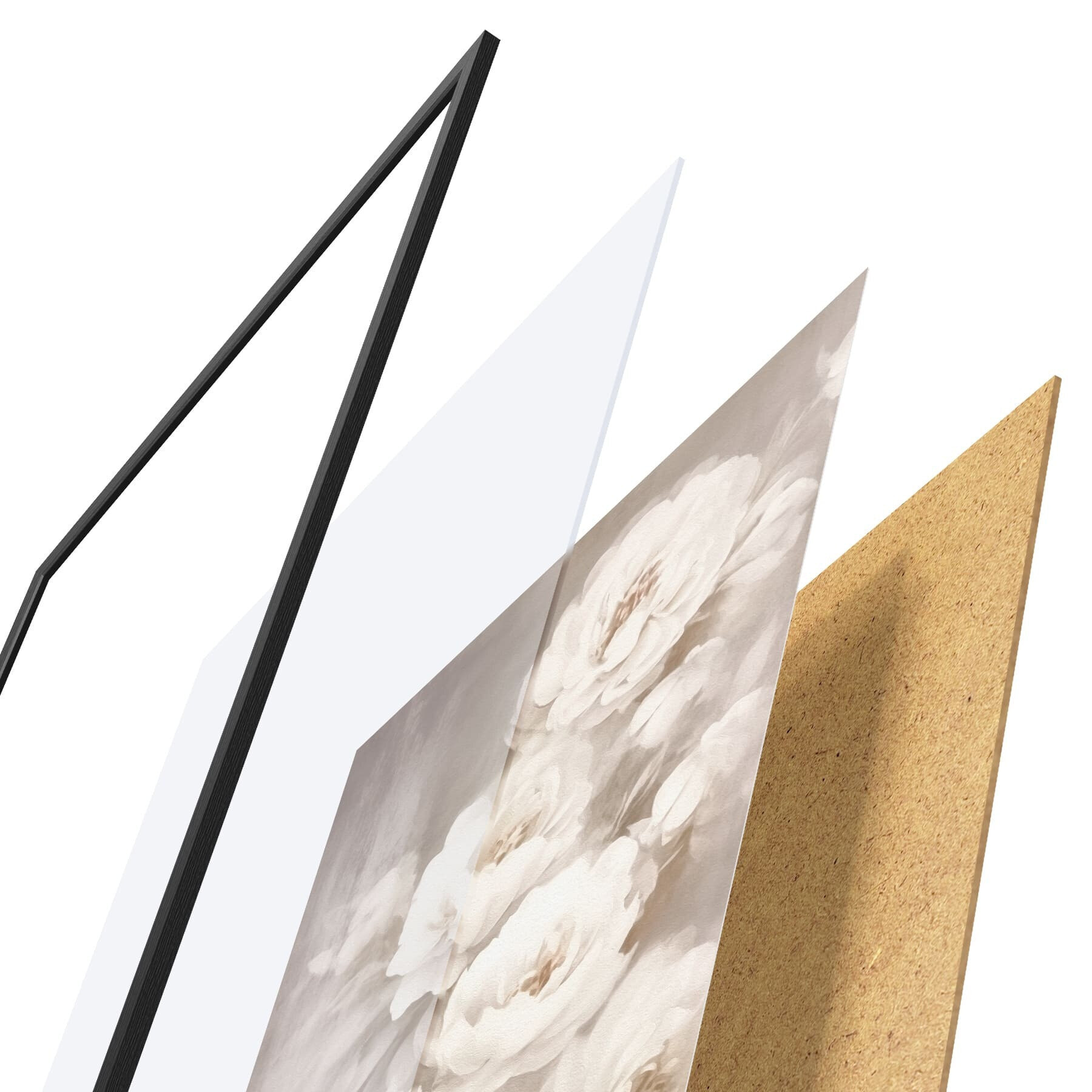 A poszter keretből, plexiből, nyomtatott képből és forgácslap hátlapból áll. A poszter a hátoldalon található rögzítőknek köszönhetően azonnal felakasztható a falra.