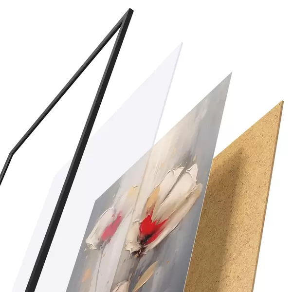 A poszter keretből, plexiből, nyomtatott képből és forgácslap hátlapból áll. A poszter a hátoldalon található rögzítőknek köszönhetően azonnal felakasztható a falra.