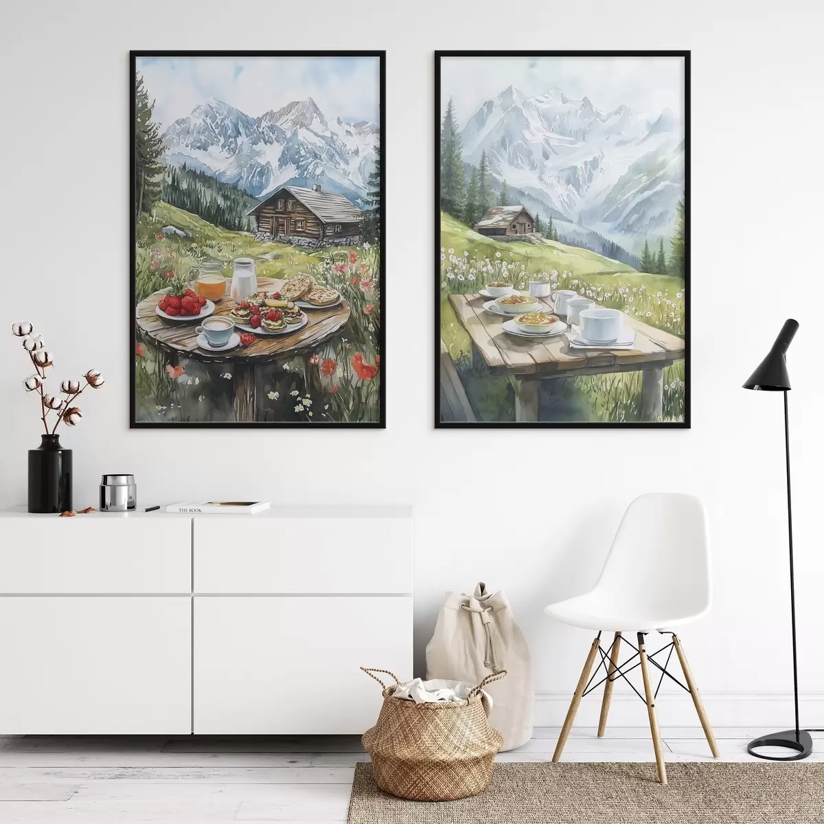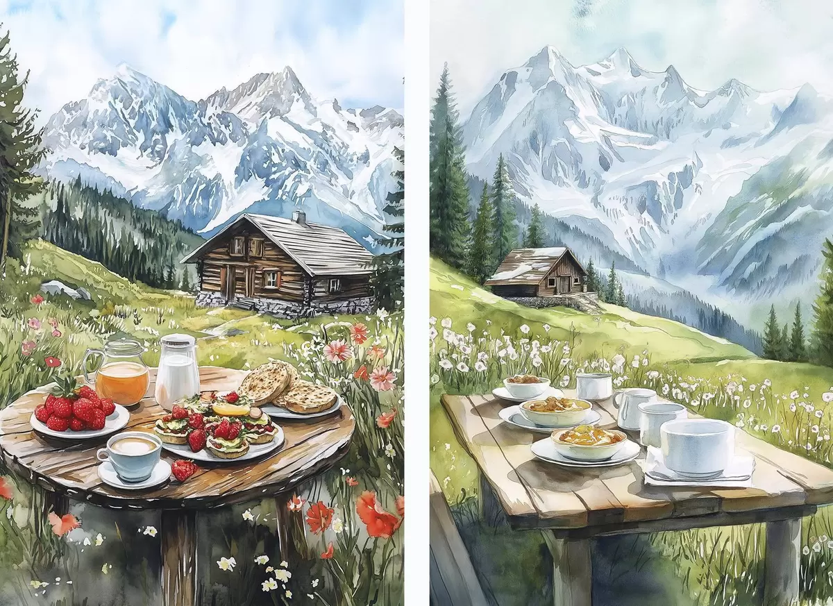 Plakát a sziklán Az Alpok, gyönyörű hegyvidéki táj, esztétikus reggeli, faházak d00403