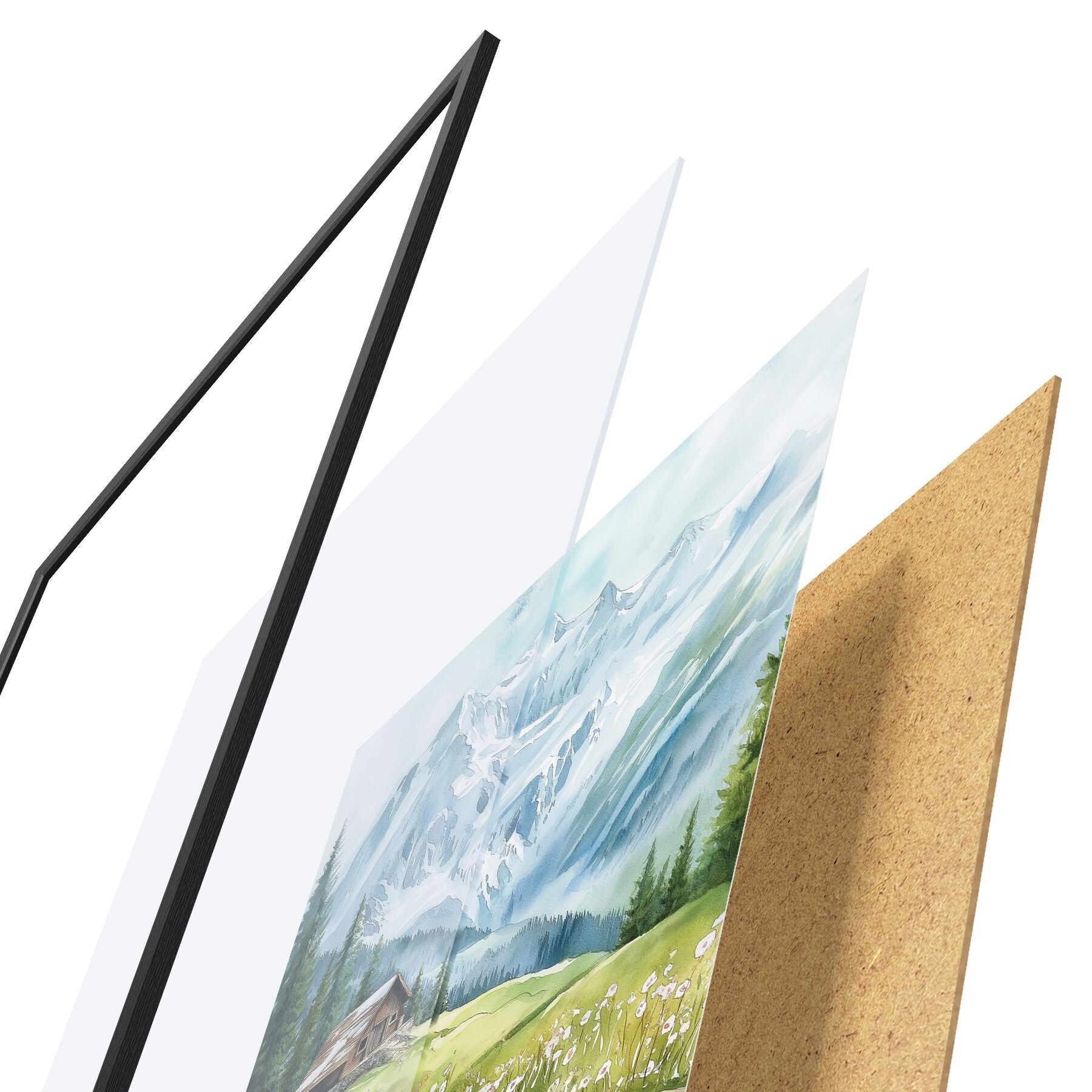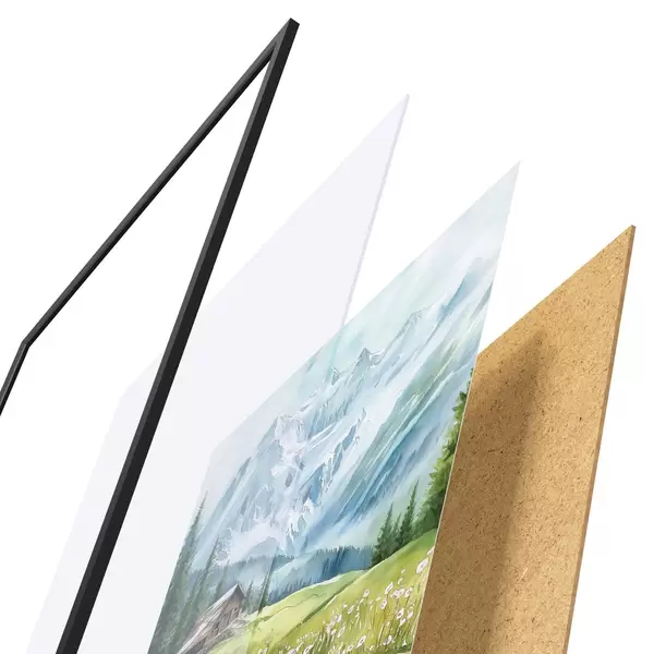 A poszter keretből, plexiből, nyomtatott képből és forgácslap hátlapból áll. A poszter a hátoldalon található rögzítőknek köszönhetően azonnal felakasztható a falra.