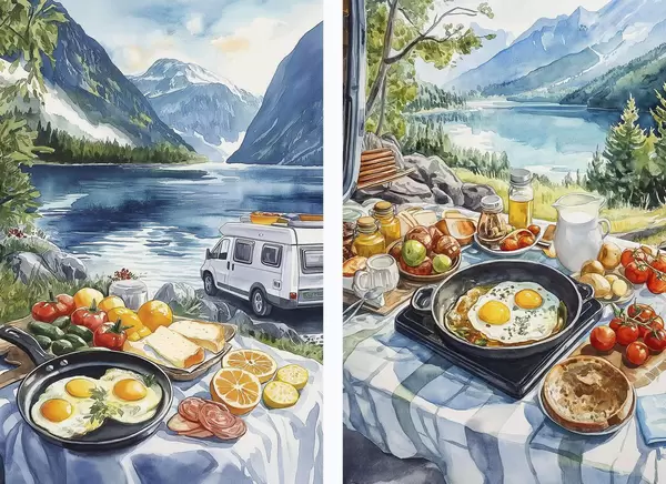 Poster Reggeli a természetben, utazás, szabadtéri élet, akvarell stílus, Norvégia Nr d00404
