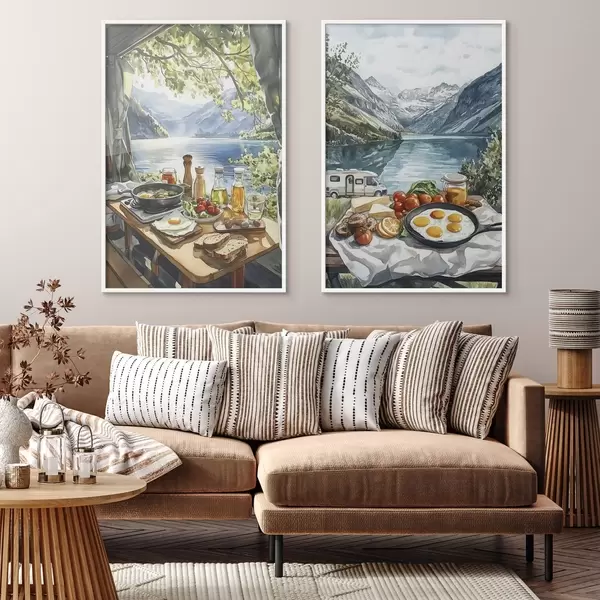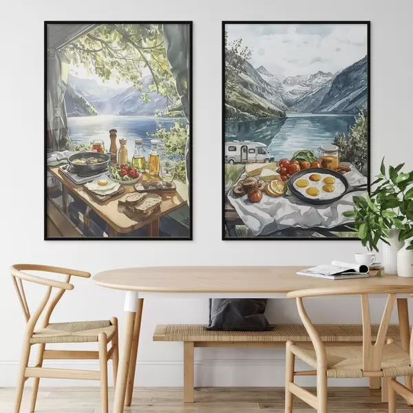 Poster Kempingezés, esztétikus reggeli a tó mellett, akvarell stílusban Nr d00405