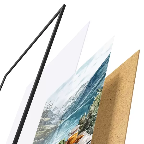 A poszter keretből, plexiből, nyomtatott képből és forgácslap hátlapból áll. A poszter a hátoldalon található rögzítőknek köszönhetően azonnal felakasztható a falra.