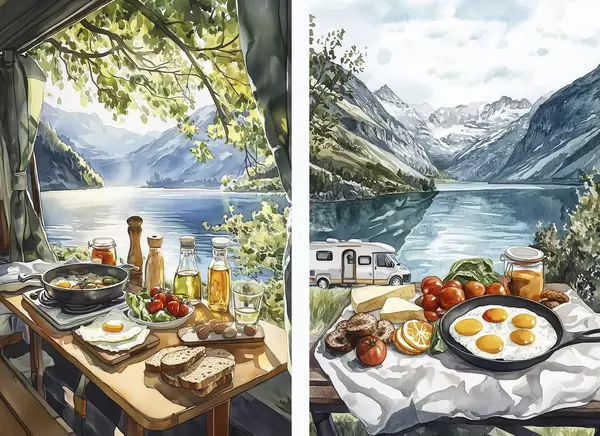 Poster Kempingezés, esztétikus reggeli a tó mellett, akvarell stílusban Nr d00405