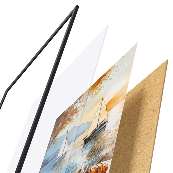 A poszter keretből, plexiből, nyomtatott képből és forgácslap hátlapból áll. A poszter a hátoldalon található rögzítőknek köszönhetően azonnal felakasztható a falra.