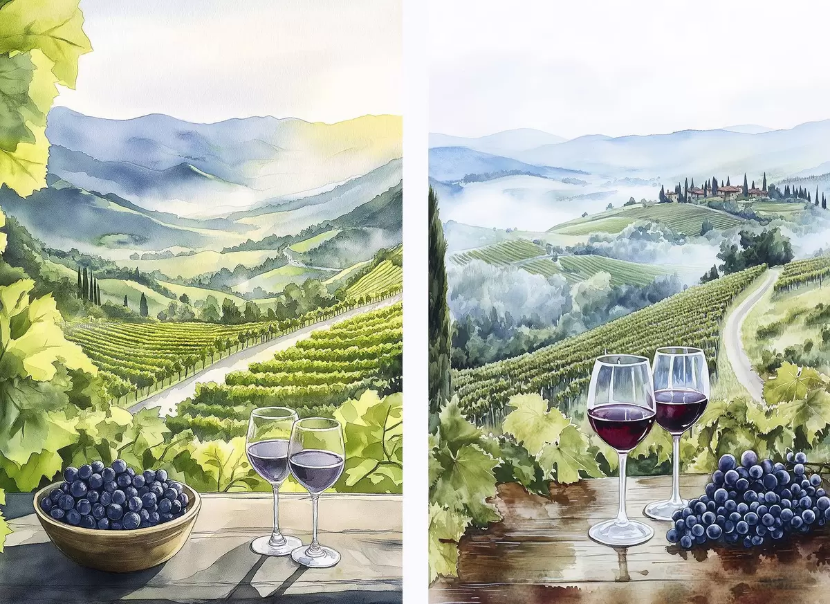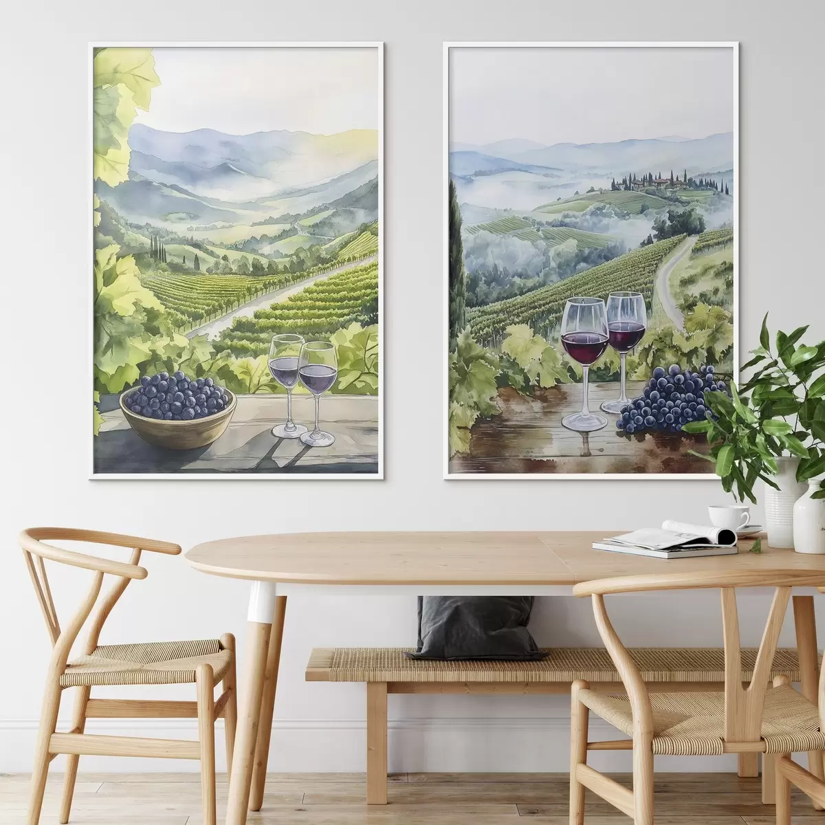 Poster Gyönyörű toszkán tájak, szőlőskertek, borospoharak, akvarell stílus, Olaszország Nr d00408