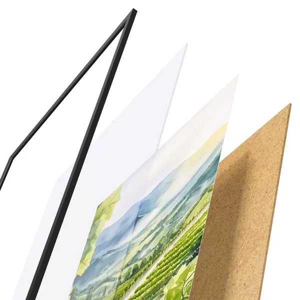 A poszter keretből, plexiből, nyomtatott képből és forgácslap hátlapból áll. A poszter a hátoldalon található rögzítőknek köszönhetően azonnal felakasztható a falra.