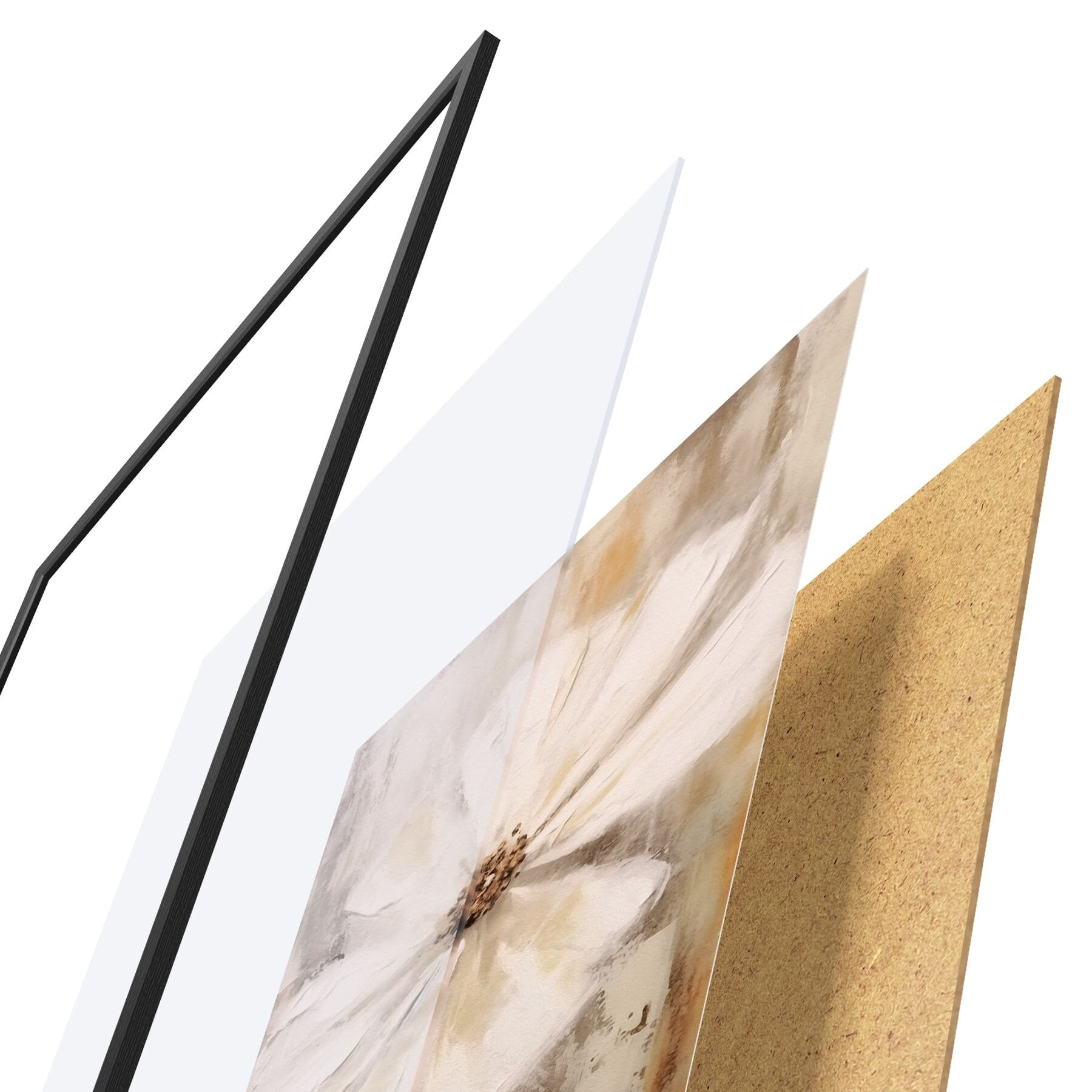 A poszter keretből, plexiből, nyomtatott képből és forgácslap hátlapból áll. A poszter a hátoldalon található rögzítőknek köszönhetően azonnal felakasztható a falra.