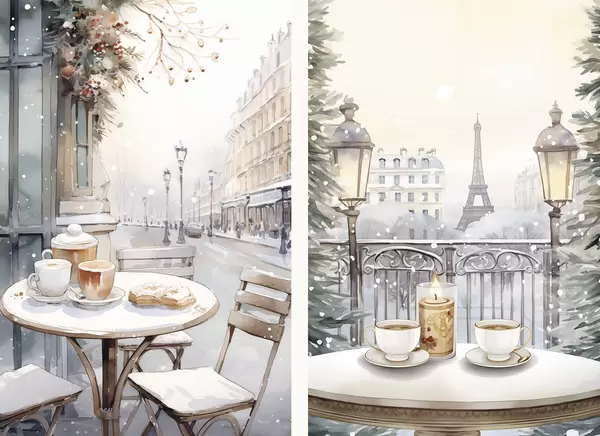 Poster Esztétikus kávézók kávéscsészékkel, Párizs utcája, tél, építészet, építészet Nr d00413