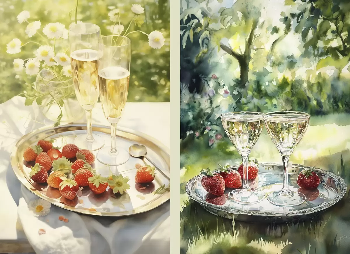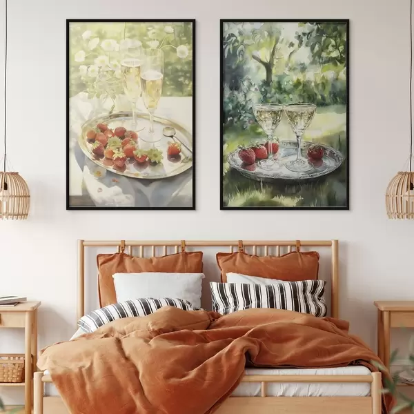 Poster Nyári piknik, pezsgőspoharak eperrel a tálcán, kamillavirágok Nr d00414