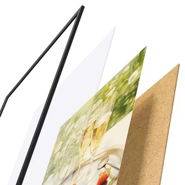 A poszter keretből, plexiből, nyomtatott képből és forgácslap hátlapból áll. A poszter a hátoldalon található rögzítőknek köszönhetően azonnal felakasztható a falra.