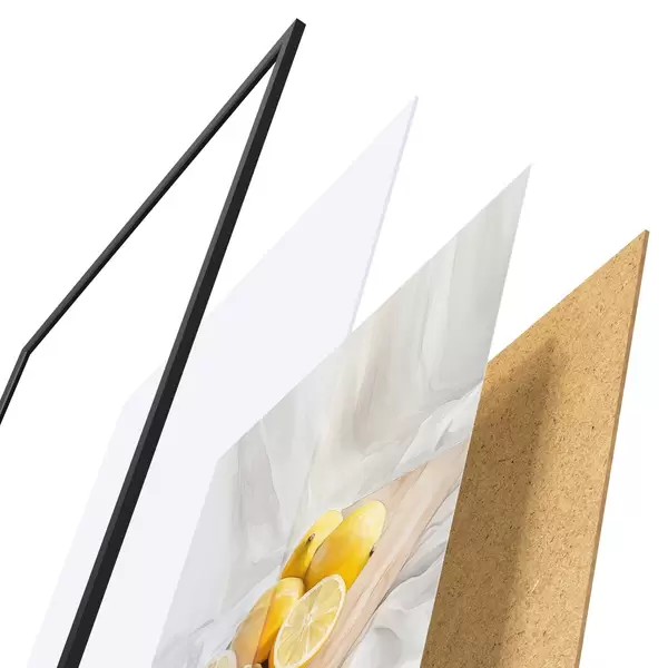 A poszter keretből, plexiből, nyomtatott képből és forgácslap hátlapból áll. A poszter a hátoldalon található rögzítőknek köszönhetően azonnal felakasztható a falra.
