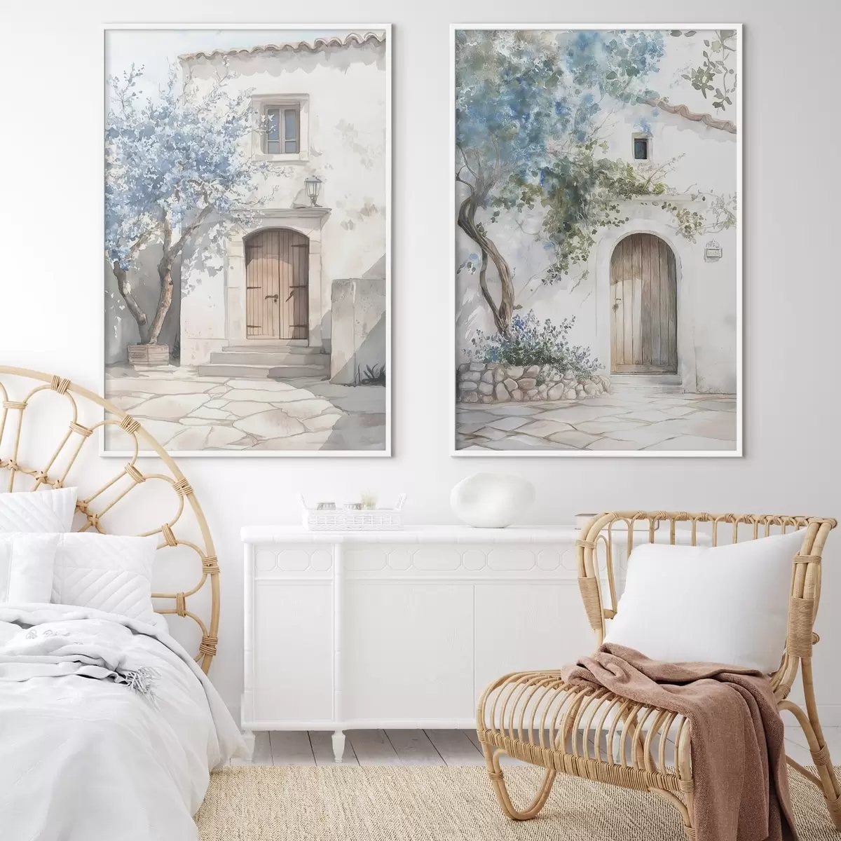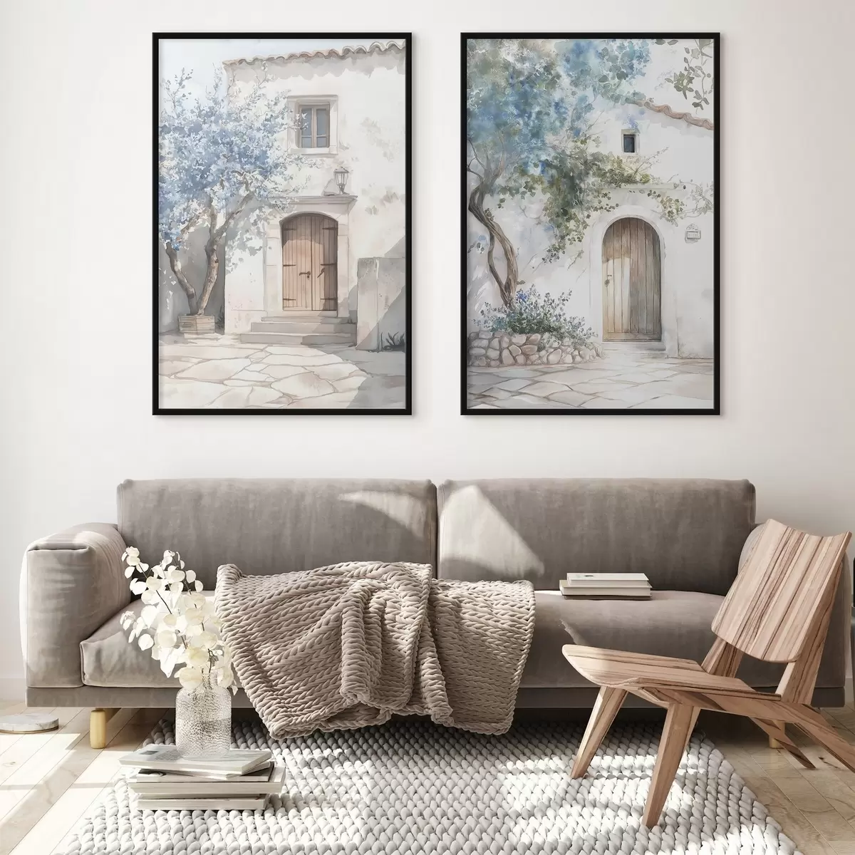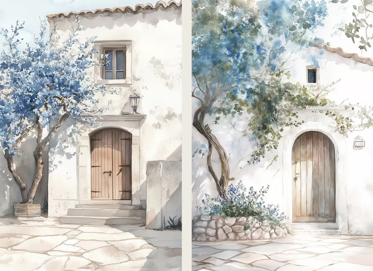 Poster Görög fehér házak, virágzó fákkal, mediterrán, akvarell stílusú rajz Nr d00419