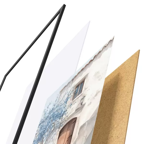 A poszter keretből, plexiből, nyomtatott képből és forgácslap hátlapból áll. A poszter a hátoldalon található rögzítőknek köszönhetően azonnal felakasztható a falra.