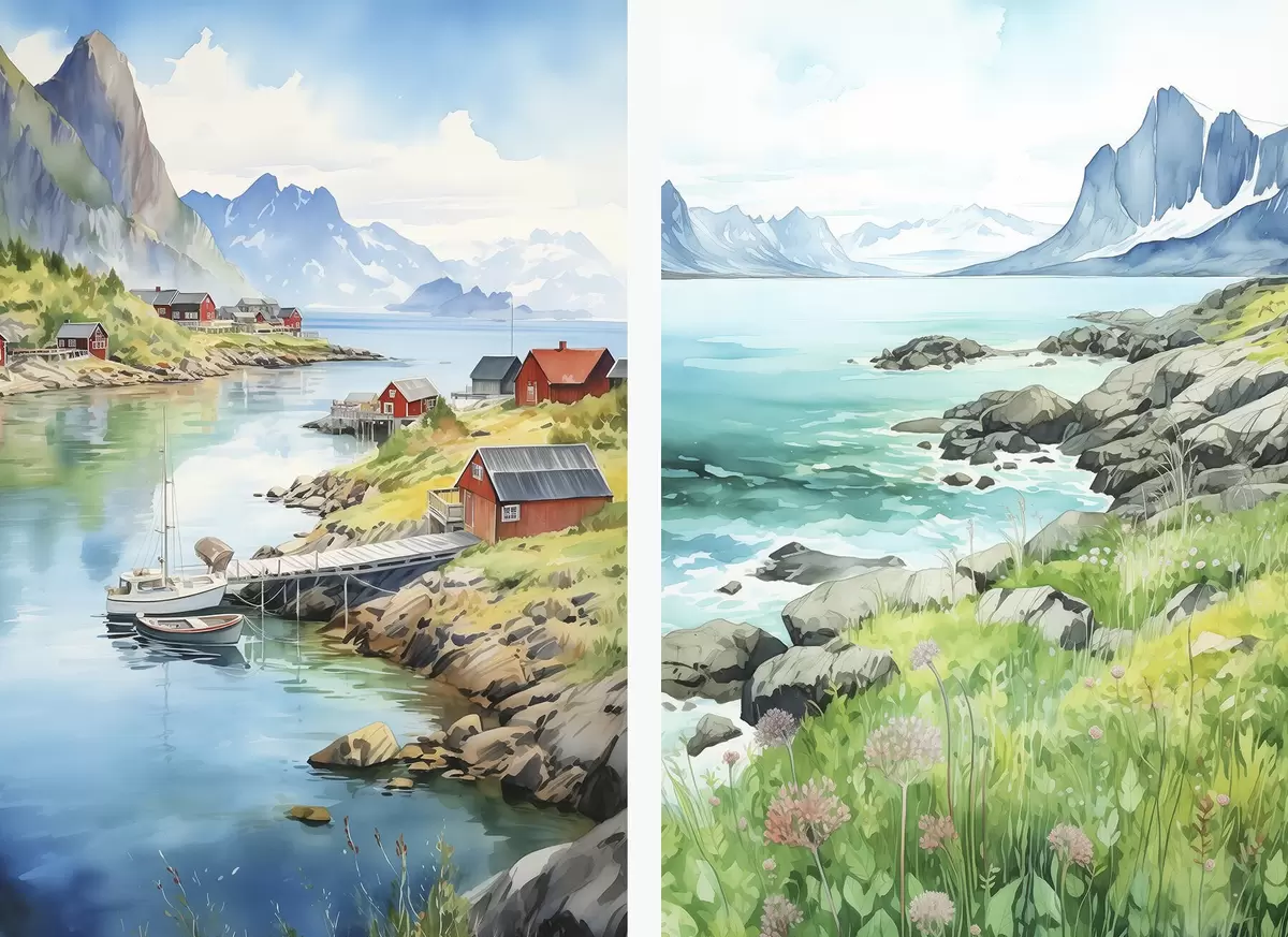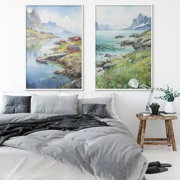 Poster Norvégia természet, Lofoten szigetek, nyári táj, vörös házak, hegyek, csónakok Nr d00421
