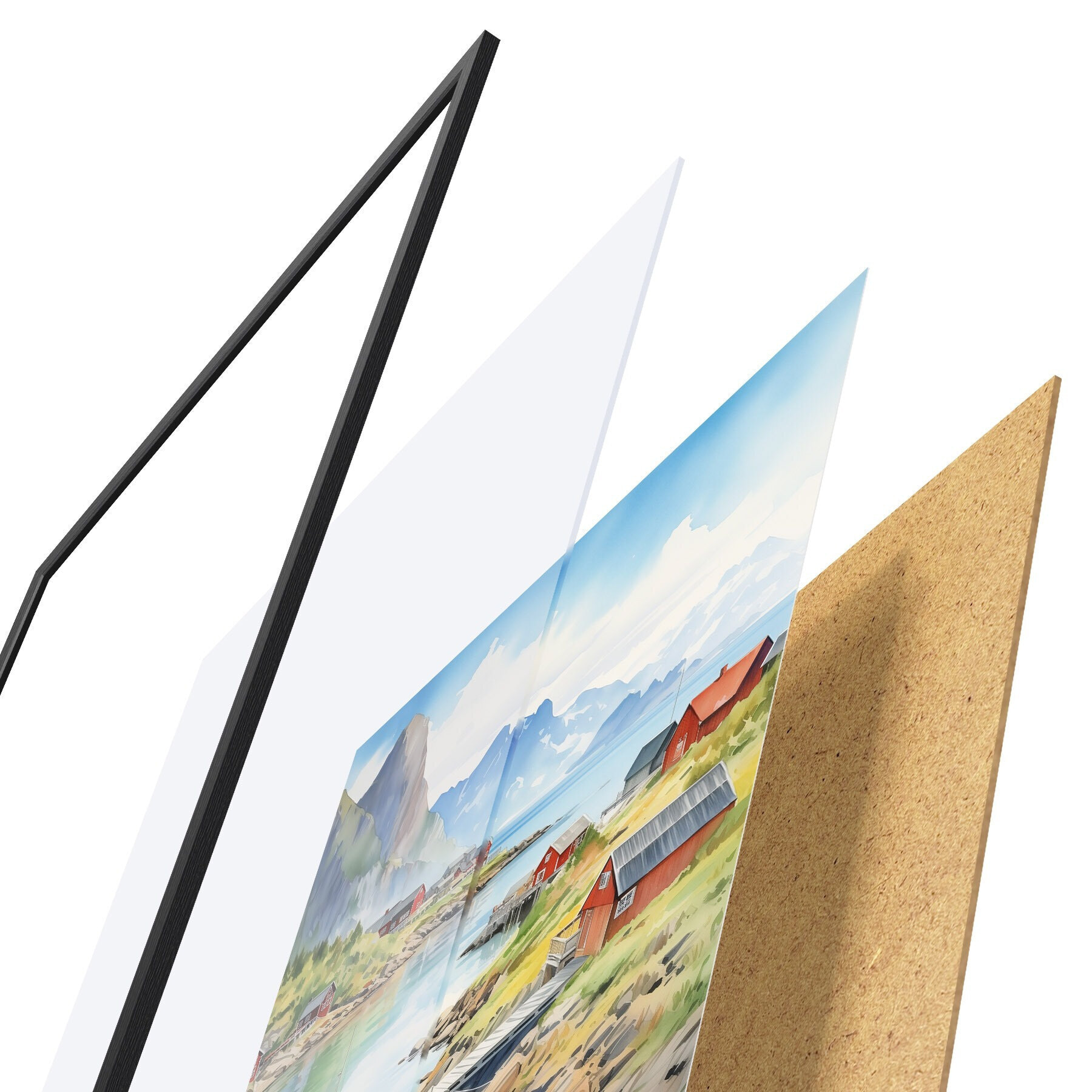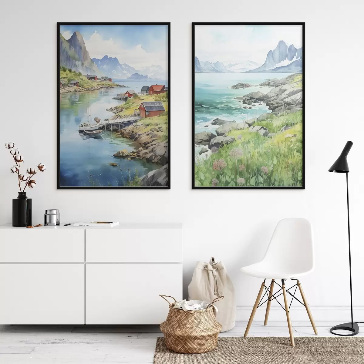 Plakát a sziklán Norvégia természet, Lofoten szigetek, nyári táj, vörös házak, hegyek, csónakok d00421