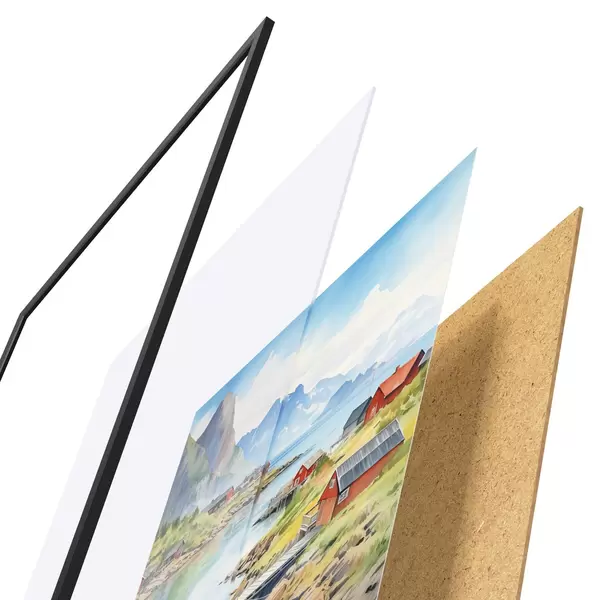 A poszter keretből, plexiből, nyomtatott képből és forgácslap hátlapból áll. A poszter a hátoldalon található rögzítőknek köszönhetően azonnal felakasztható a falra.