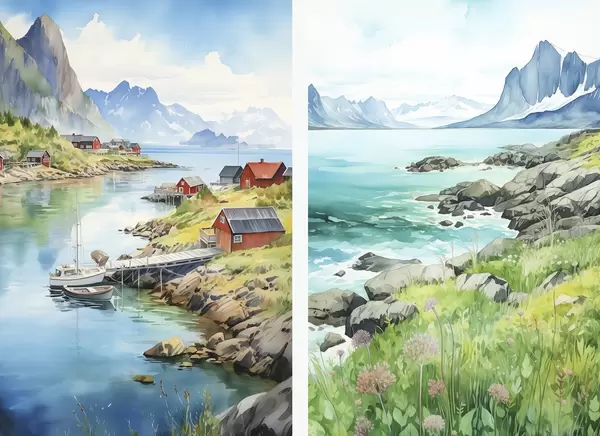 Plakát a sziklán Norvégia természet, Lofoten szigetek, nyári táj, vörös házak, hegyek, csónakok d00421