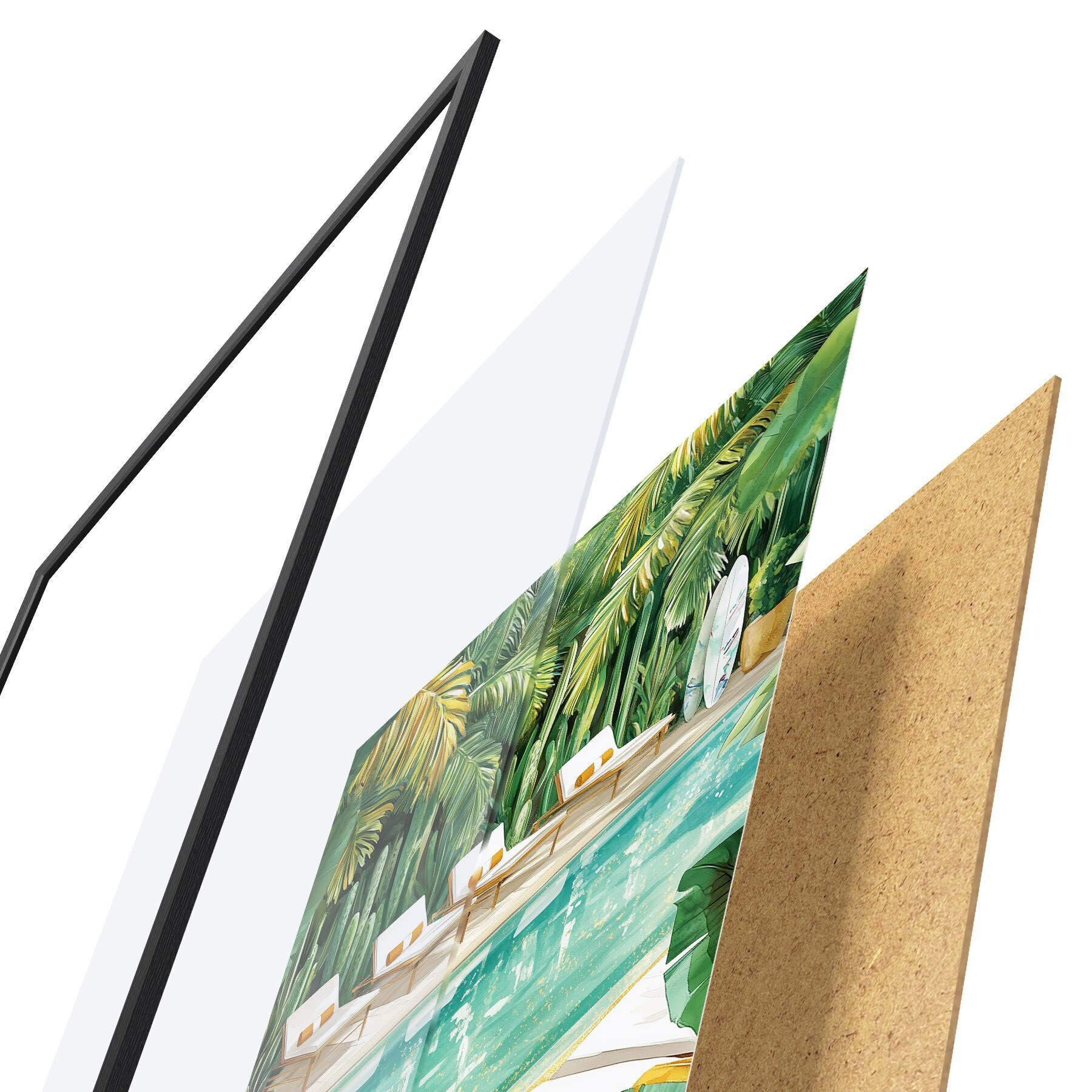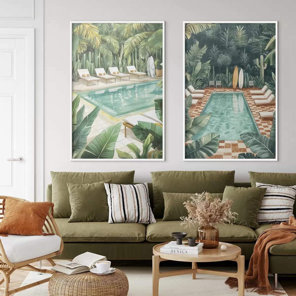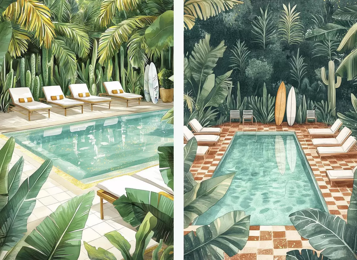 Poster Nyári medence, vintage, trópusi erdő, zöld, pálmafák, vízfestmény stílusban Nr d00422