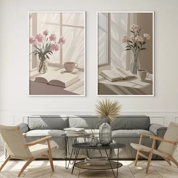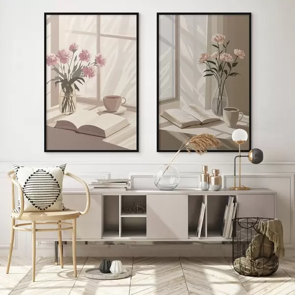 Poster Absztrakció, reggeli esztétika, csésze kávé, könyv, virágok Nr d00448