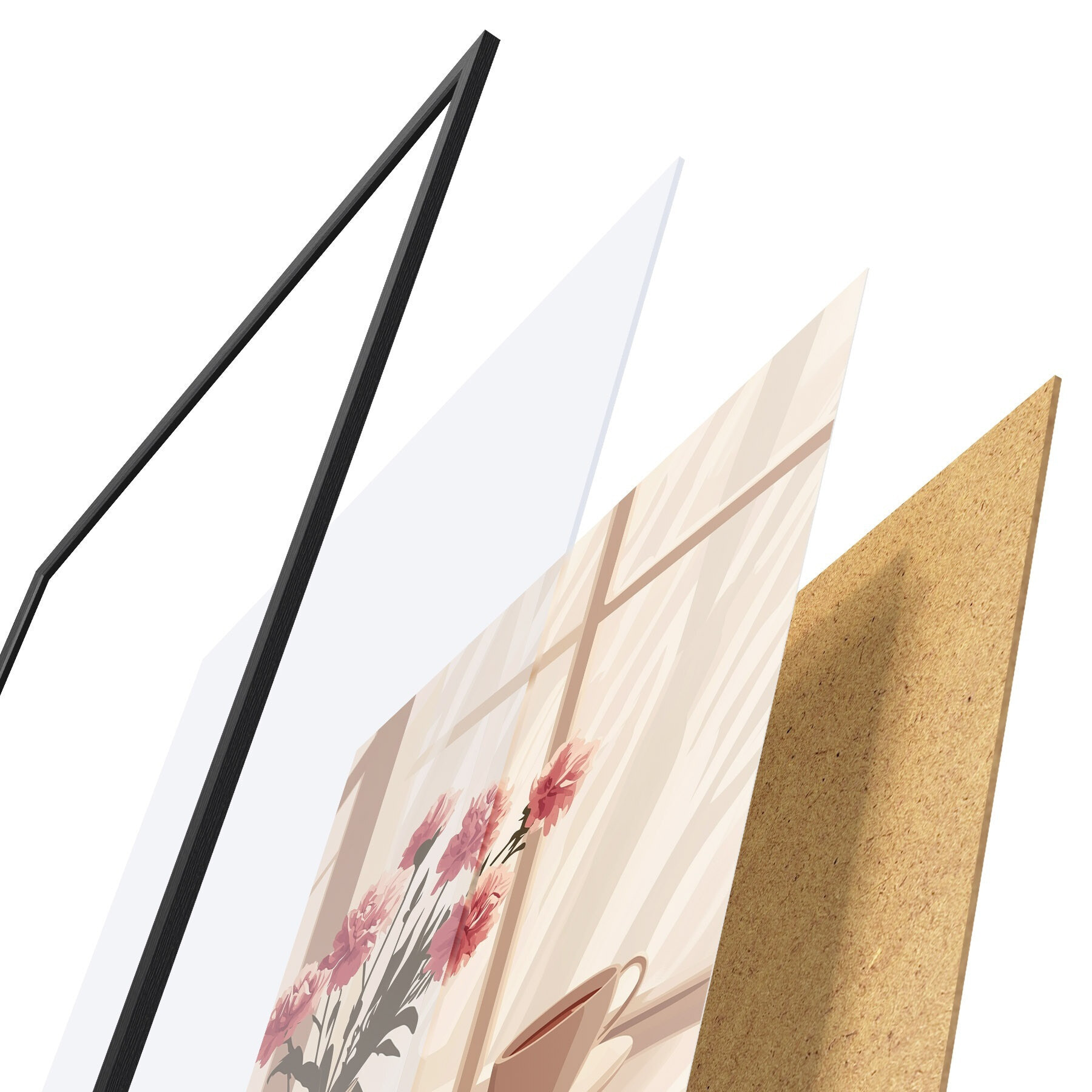 A poszter keretből, plexiből, nyomtatott képből és forgácslap hátlapból áll. A poszter a hátoldalon található rögzítőknek köszönhetően azonnal felakasztható a falra.